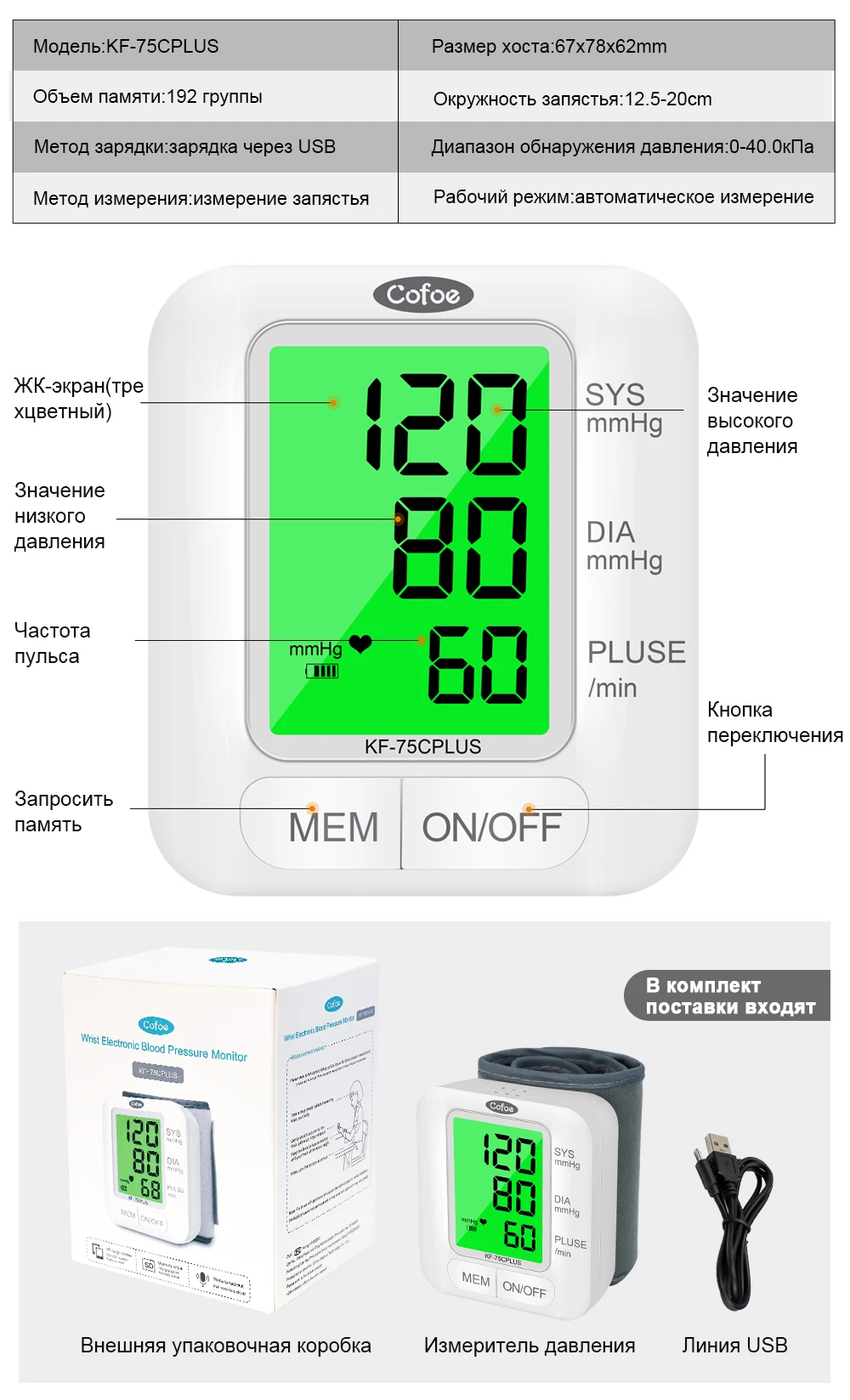 Доставка в Канаду занимает 15 дней. Cofoe-отличная компания в Китае. Большой экран легко читается. KF75CPLUS встроенный аккумулятор с голосовыми отчетами. Используйте usb-кабель для зарядки. К сожалению, мой товар был неточным по сравнению с другими. Прочитайте на 20% больше, чем другие. Но это хорошая сделка и рекомендуется. Удачи