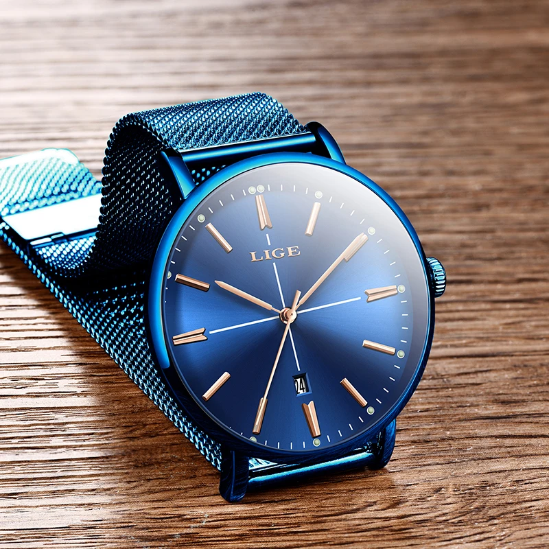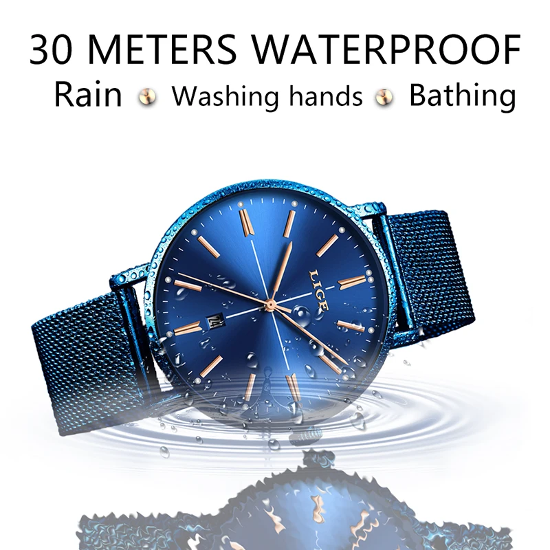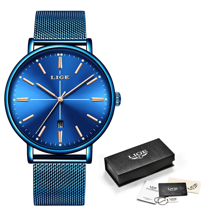 Relogio Feminino LIGE, новые синие часы, женские роскошные брендовые модные часы, кварцевые часы для девушек, полностью стальной сетчатый ремешок, водонепроницаемые часы
