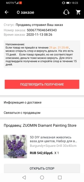 Заказ не пришёл! Очень жаль. Открыла спор, деньги вернули очень быстро, через 3 дня.