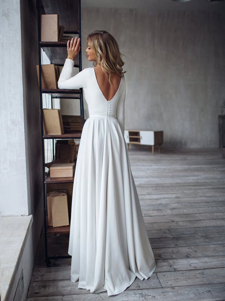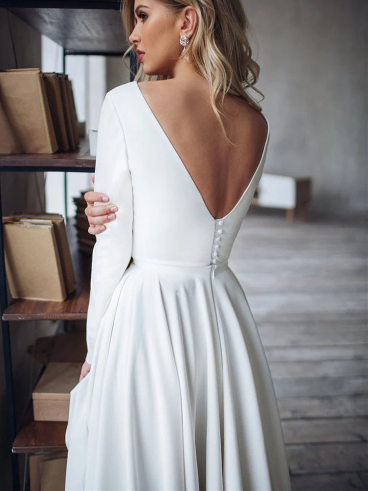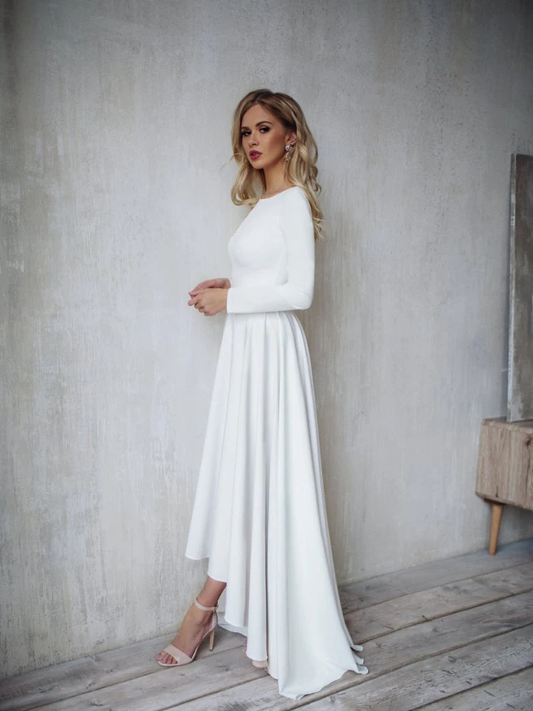 Свадебное платье с длинным рукавом, простой дизайн, сдержанный, с открытой спиной, короткий спереди длинный сзади, винтажный наряд невесты в стиле ретро, на заказ