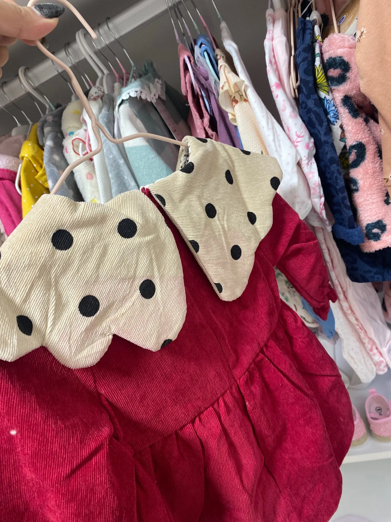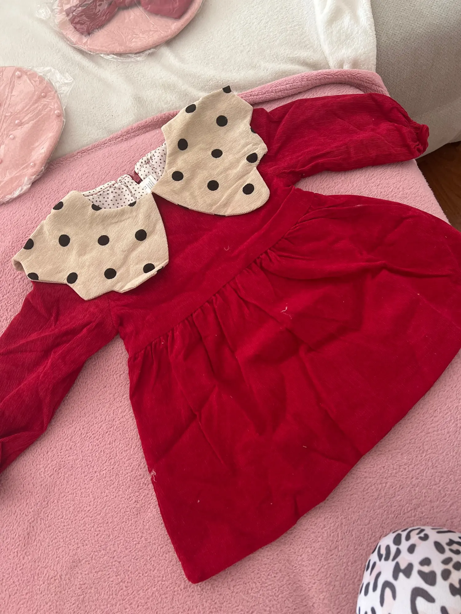 Хорошее платье, темно красный, мелкий вельвет, воротник беж в горох. Подклад хб. Размер на 9 мес. 8500кг. 69/70 см. немного большой. Горловины широкая. На год думаю будет хорошо уже. Думаю будет линять. Воротник снизу подкрасился немного.