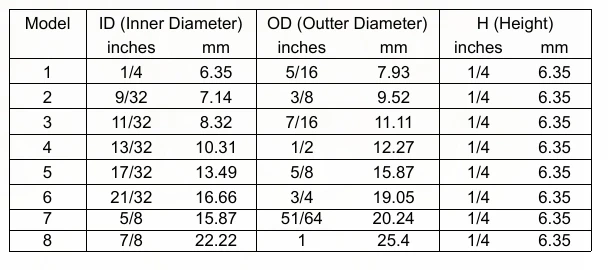 В набор входят 8 направляющих втулок и 2 кольца со следующими диаметрами отверстий: