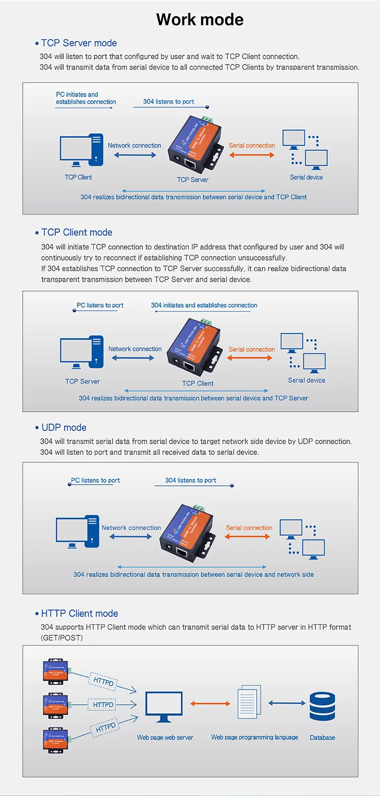Особенности Ethernet-преобразователя RS485Поддержка DHCP, автоматическое получение IP-адреса и запрос IP-адреса через протокол серийной настройкиПоддержка функции DNSУстановить параметры через веб-страницуОбновление прошивки через сетьAuto-MDI/MDIX, порт RJ45 с 100 Мбит/сСкорость передачи данных последовательного порта от 600 bps до 230,4 кбит/с, контрольный бит None, Odd, Even, Mark и SpaceРежим работы: TCP-сервер, Клиент TCP, клиент UDP, UDP-сервер, клиент HTTP PDПоддержка виртуального последовательного порта и соответствующее программное обеспечение USR-VCOMМеханизм посылка сердцебиения для обеспечения надежности соединения Положите конец мертвому звенуИспользуйте r-определенный механизм пакпосылка регистрации, проверьте статус подключения и используйте в качестве пользовательского заголовка пакетаВ режиме TCP-сервера количество клиентов колеблется от 1 до 16; По умолчанию-4Глобальный Уникальный MAC-адрес, купленный в IEEE, пользователь может определить заводское восстановление MAC-адреса по умолчаниюЧерез шлюз, коммутаторы, маршрутизаторыМожет работать в LAN, также может работать в Интернете (внешняя сеть)Предоставление примеров программирования сокетов PC TCP/IP, таких как VB,C ++,Delphi,Android и IOSПоддержка кастомизации