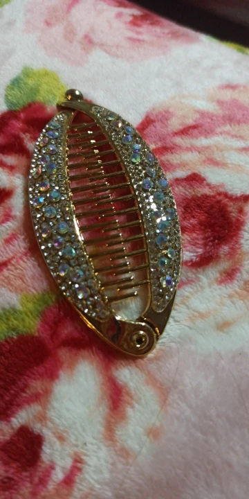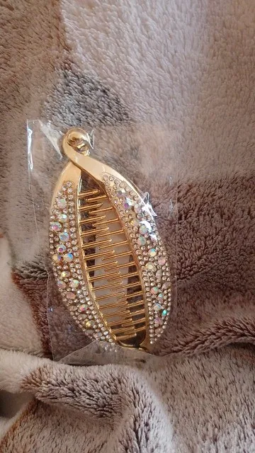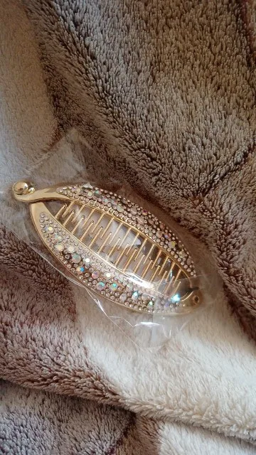 заколка красивая, но неудобная. хлипкая очень, стразы приклеены очень плохо, причем на остатки клея берется волосы. снимая заколку очень больно- вырывает часть волос