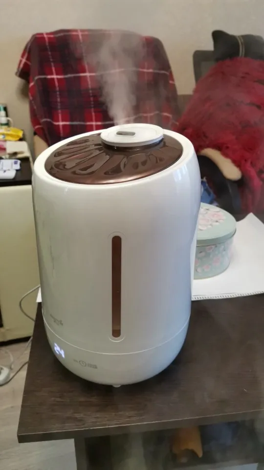 отличный увоажнитель, очень очень тихий в работе, почти не слышно, изредка (на самой максимальной мощности примерно раз в 20 минут едва слышно бульки) на других мощностях(1-2) булькает реже, спать абсолютно не мешает. не течёт, но верхнюю крышку надо чётко ставить на место иначе с неё может течь. бак как и заявлено 5литров а то и чуть больше, это удобно не бегать наливать каждый день. удобная ручка для переноски бака, три режима мощности пара, дисплей показывает температуру, есть таймер до 12 часов кажется, и ночной режим (отключение дисплея, нужно нажать и удерживать кнопку таймера) очень простое управление, простая заправка водой. единственное как и во всех ультразвуковых увлажнителях воду надо лить с фильтра, налёта на мебели не будет от солей жёсткости, сам прибор прослужит долго, да и для здоровья дышать солями жесткости не стоит думаю. на максимальной мощности производительность очень хорошая. вилка китайская но если выбрать евровилку в комплекте идёт переходник. доставка 4 дня