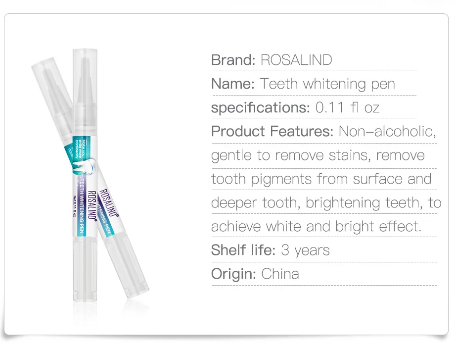 Бренд: ROSALIND Название: отбеливающая ручка для зубов характеристики: 0,11 floz характеристики продукта: безалкогольный, Бережный для удаления пятен, удаления пигментов зубов с поверхности и более глубоких зубов, осветление зубов, для достижения белого и яркого эффекта. Срок годности: 3 года Происхождение: Китай