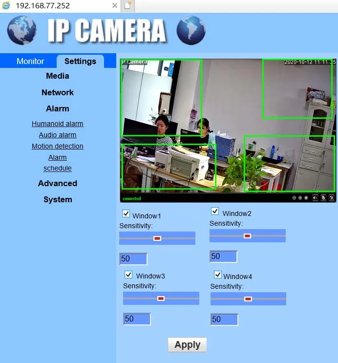5. Параметры распознавания форм человека: Поддержка переключателя распознавания форм человека. Поддержка настройки рамы гуманоида, поддержка настройки чувствительности гуманоидного распознавания. И поддерживает два режима сигнализации независимого запуска и переключения