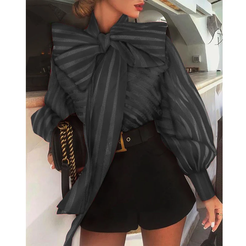 Женские топы, Повседневная рубашка, сетчатые Топы с длинным рукавом-фонариком, полосатые топы с большим бантом, Деловая блузка, рубашки, Офисная Женская блузка