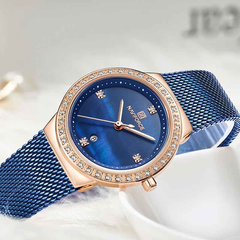 Модные брендовые женские кварцевые часы NAVIFORCE с сетчатыми ремня...