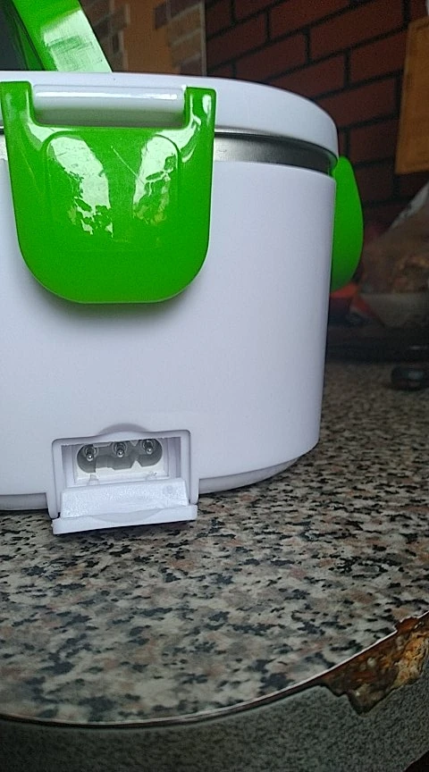 Пришло относительно быстро. В комплекте ёмкость из нержавейки в отдельном запаянном пакете, небольшой пластиковый контейнер, ложка, два кабеля для подключения к 220 В и в прикуриватель 12 В, и инструкция на английском. Для охлаждённых (не замороженных) продуктов время разогрева указано 25 минут. Интересный способ подключения кабеля - центральный контакт в гнезде аппарата общий, крайние - для 220 В (на фото) и 12 В соответственно. Особой формы гнездо предназначено для подключения каждого кабеля только к "своим" контактам. Хотя если приложить некоторые усилия, наверняка можно подключить неправильно, и тогда становятся понятными отзывы, где чуть ли не после первого включения аппарат сгорел) В общем, время покажет, насколько удобен данный контейнер с функцией разогрева.