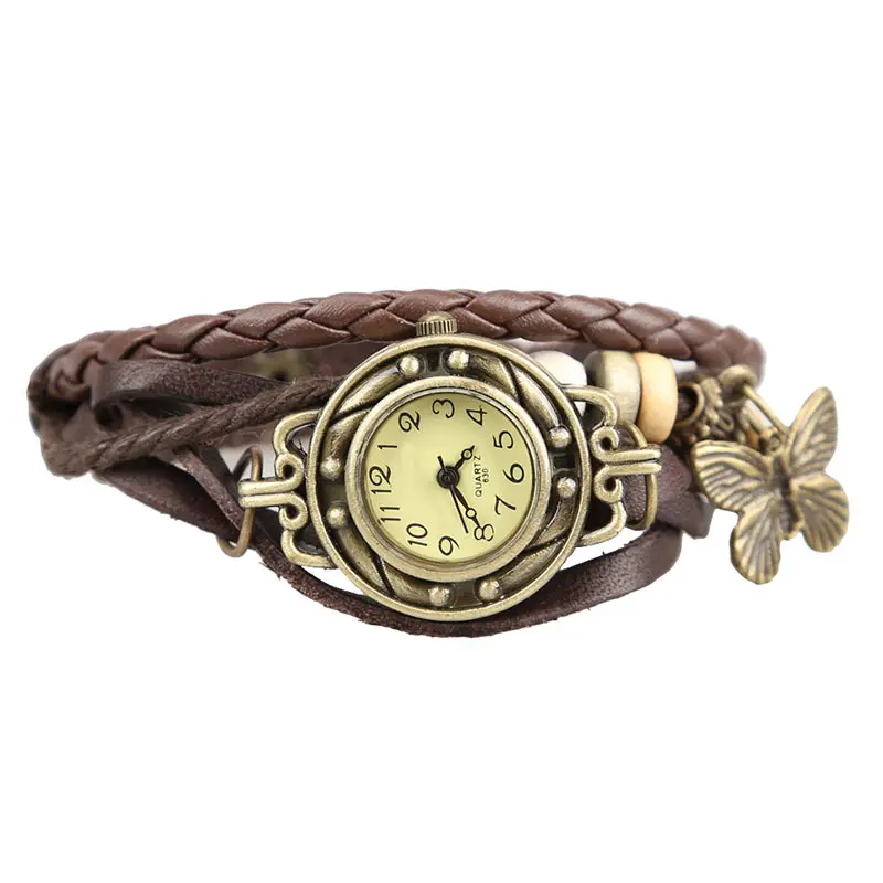 Новый женский Ретро Браслет, наручные часы, плетеный браслет, искусственная кожа, Бабочка, бусины, подвеска, цепочка FIF66