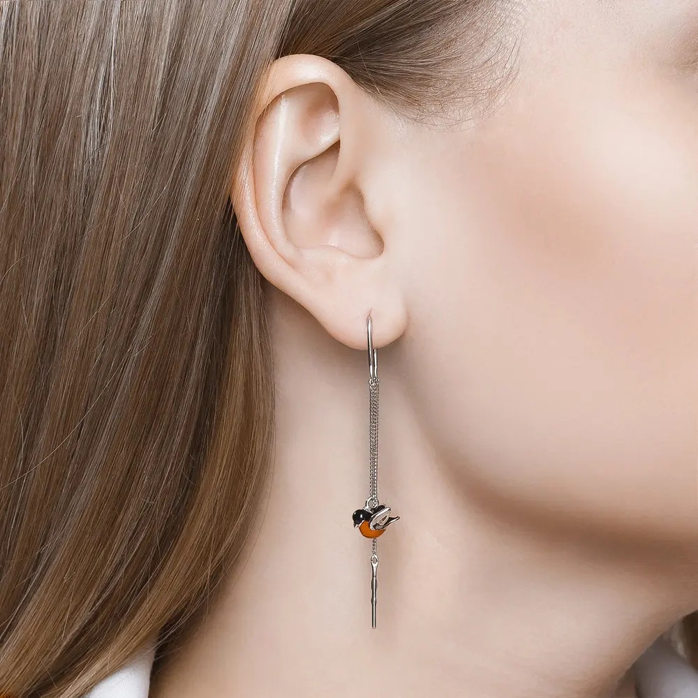 Серьги-продёвки со снегирями SOKOLOVОсобая конструкция серёг-продёвок позволила сделать фигурки снегирей подвижными, поэтому кажется, что они порхают. Это серьги без замка, которые просто надеваются, комфортно носятся, не рискуют расстегнуться и потеряться. Использование качественных эмалевых красок позволило сделать фигурки птичек максимально яркими и естественными. Необычное украшение поможет вам даже в привычных нарядах выглядеть креативно!