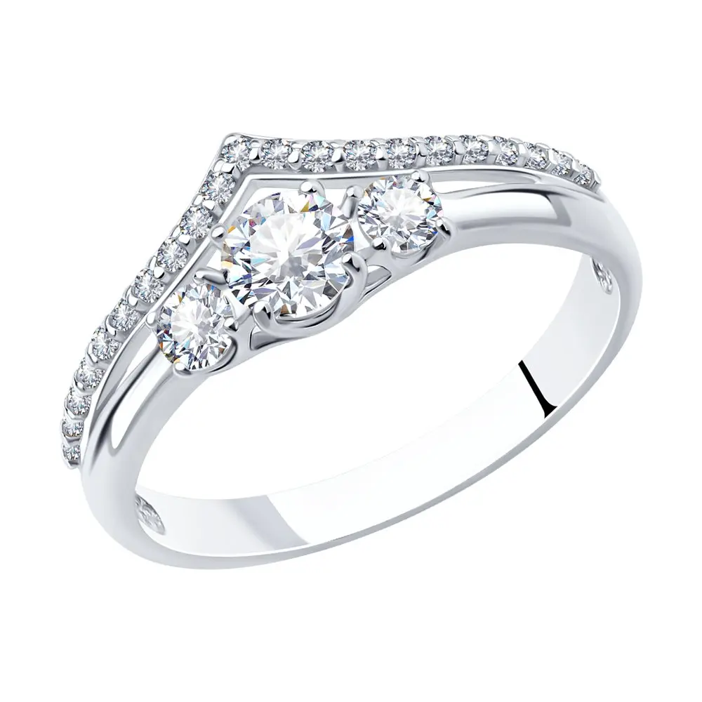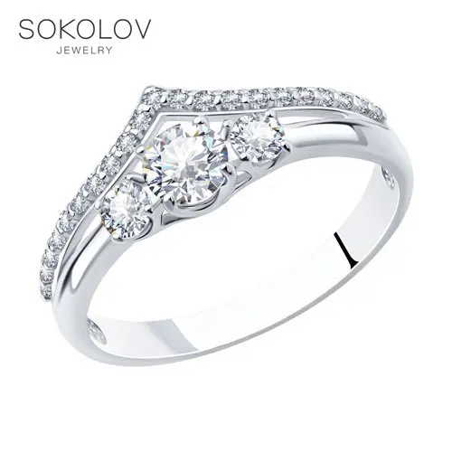Кольцо SOKOLOV из серебра с фианитамиЭто серебряное кольцо с фианитами украсит руку современной принцессы. Оригинальная шинка повторяет форму диадемы, венчая блестящее трио из крупных камней. Декор из фианитовой россыпи подчёркивает изящность и «воздушность» дизайна. Кольцо носится как самодостаточное украшение или в комплекте с минималистичными моделями, составляя эффектный ювелирный сет для будней и праздников.