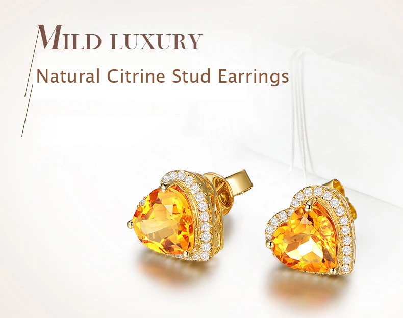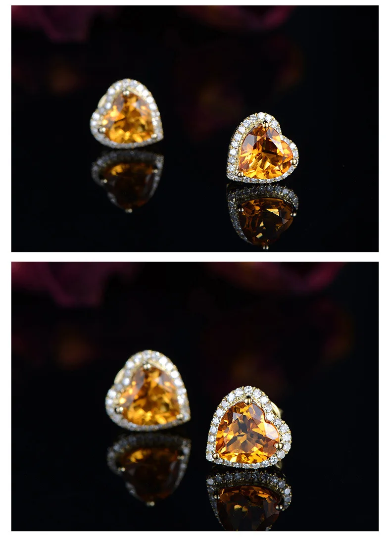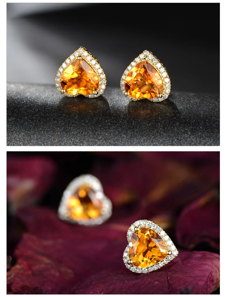 Женские серьги-гвоздики с натуральным цитрином в форме сердца, 18 К, золото, цвет AAA, циркон, бриллиант, желтый драгоценный камень, серьги, серебро 925 пробы, ювелирные украшения
