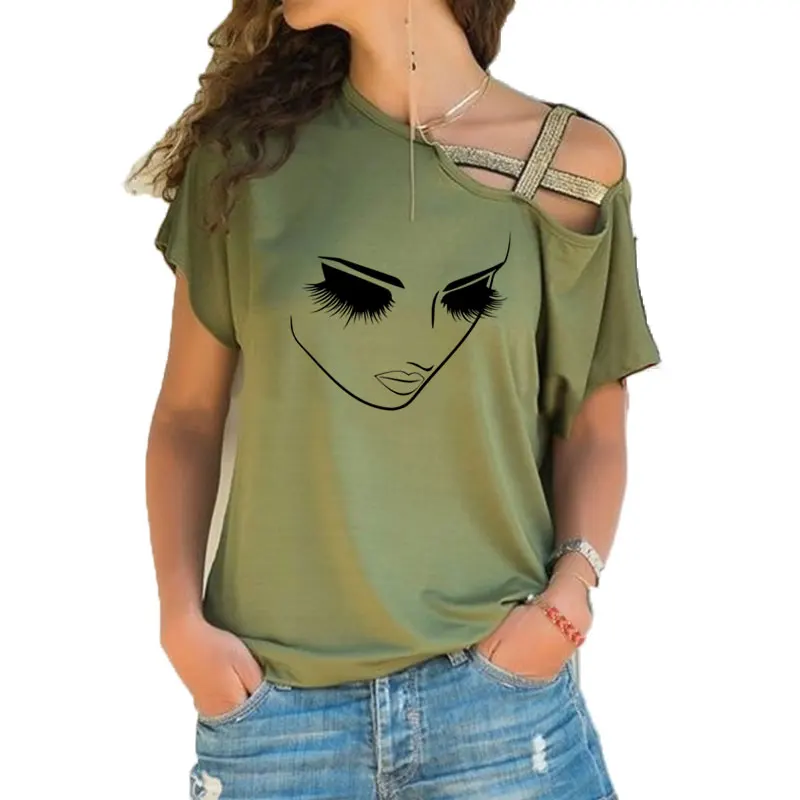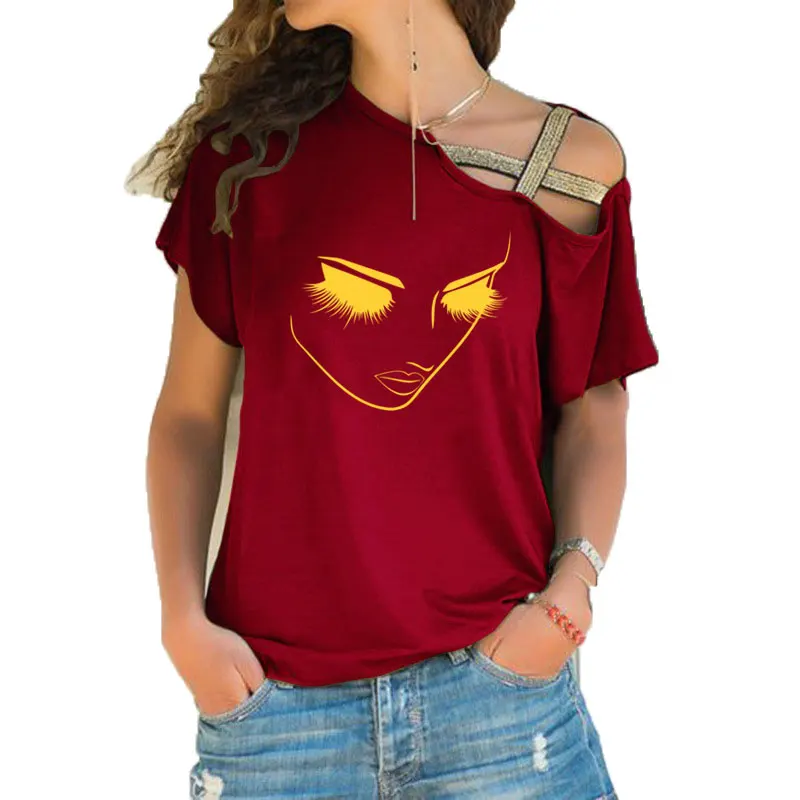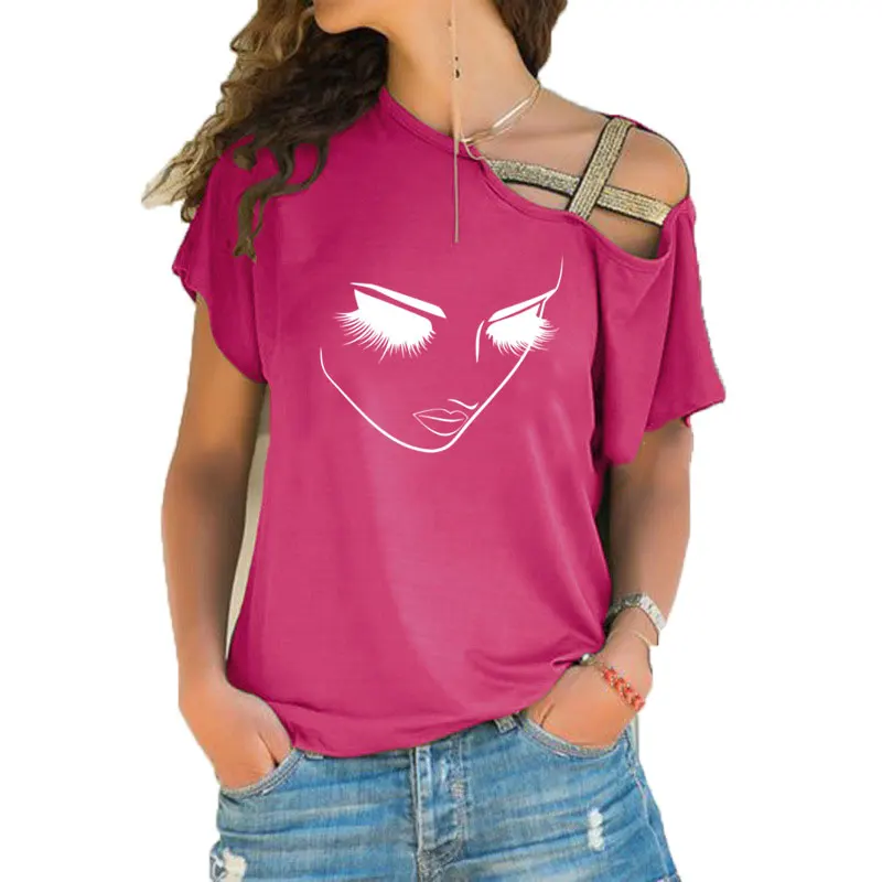 Модные женские футболки с принтом ресниц для салона красоты, футболка с длинными ресницами для девушек, топы с коротким рукавом и асимметричным скошенным перекрестным поясом, футболки