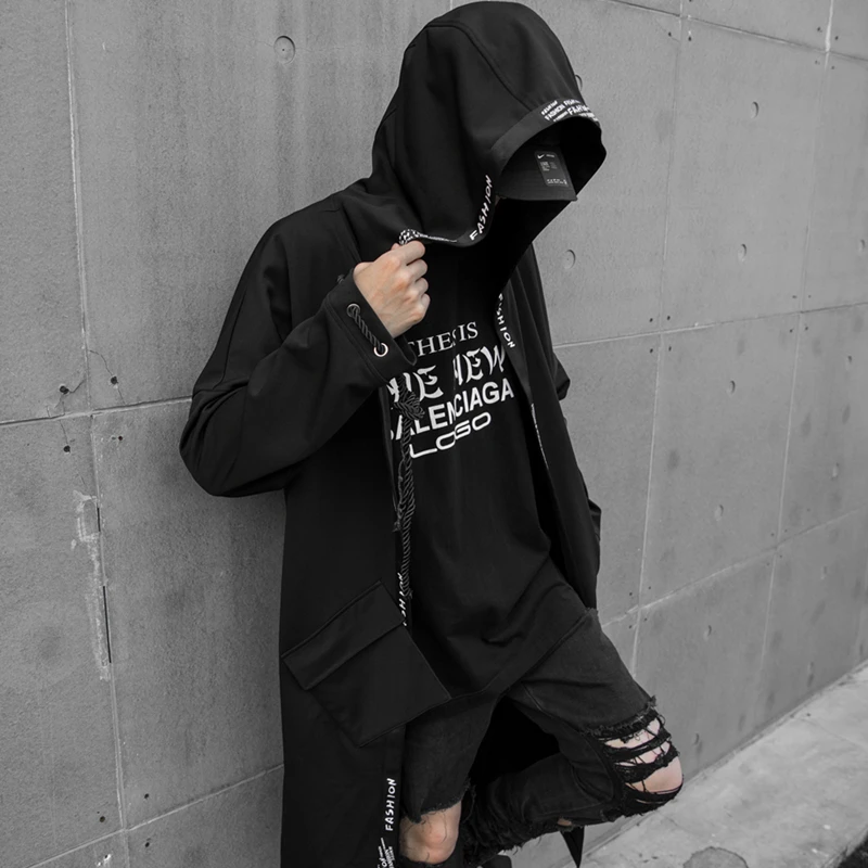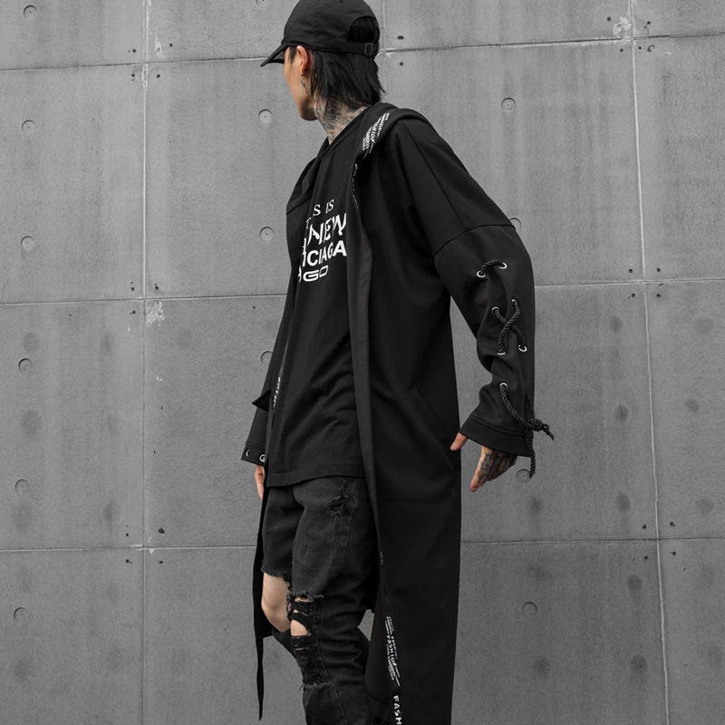Длинный Тренч с капюшоном в стиле панк-рок, Мужской Черный Асимметричный Тренч в Корейском стиле на осень и весну