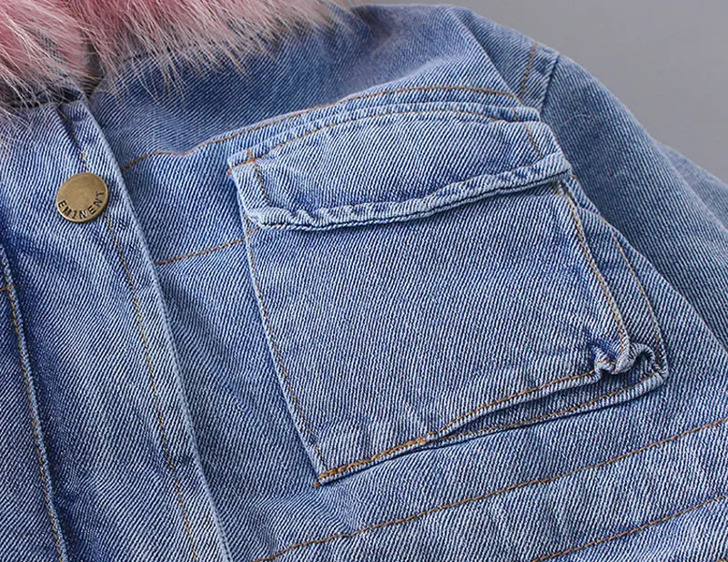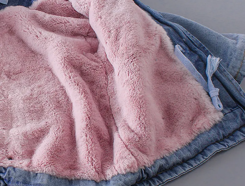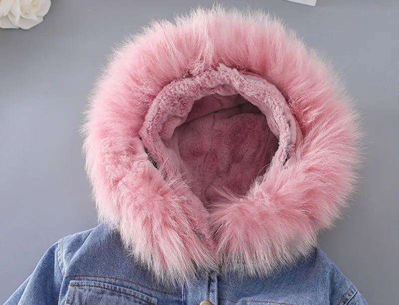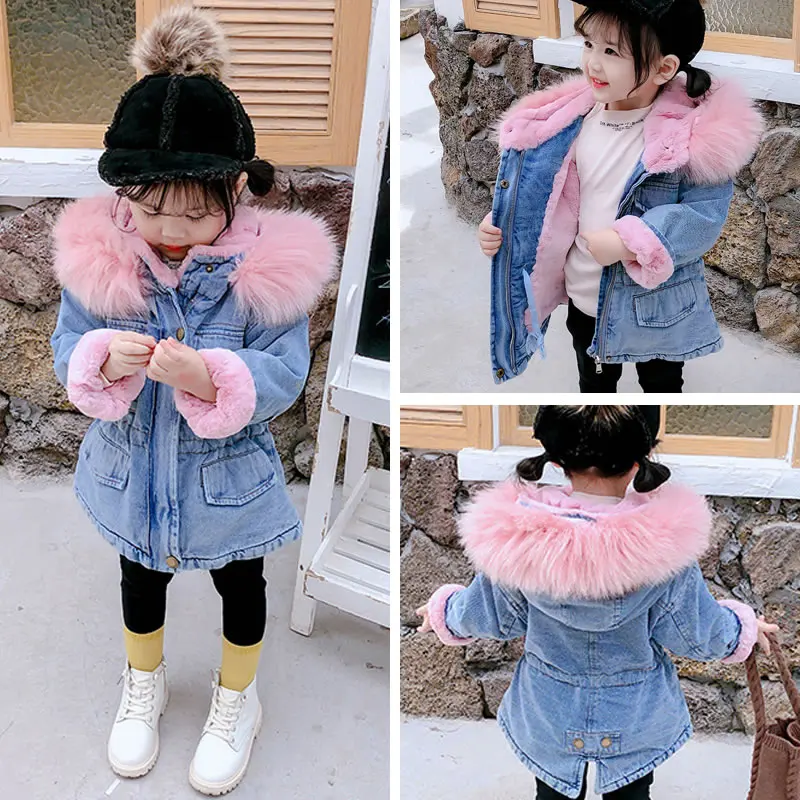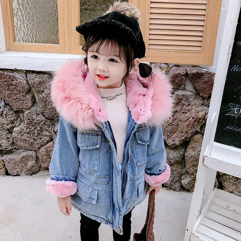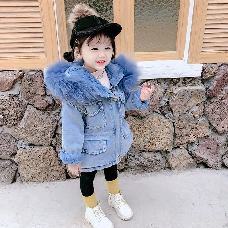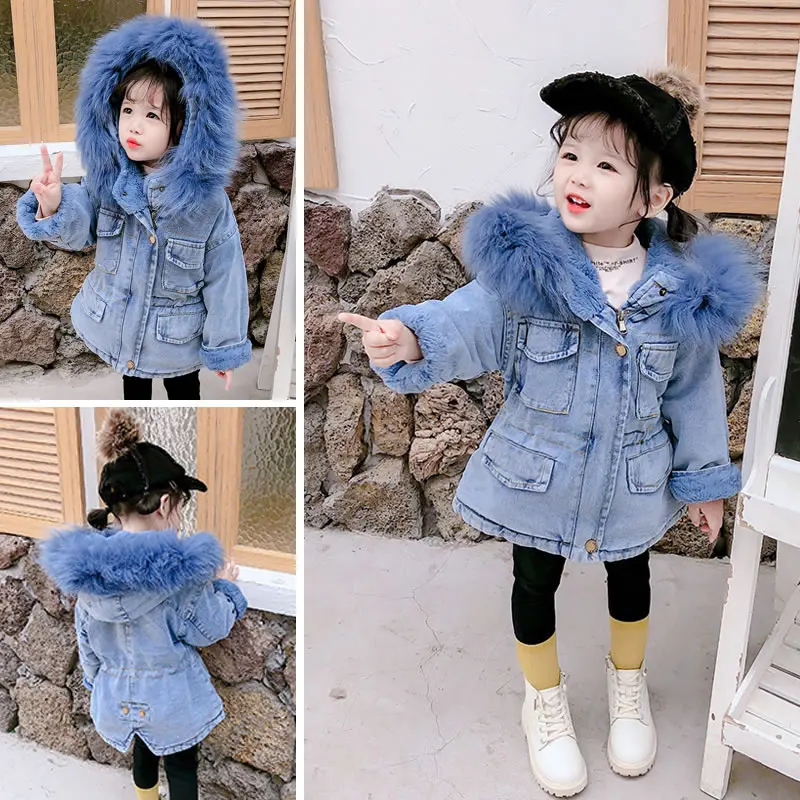 Корейская джинсовая куртка для маленьких девочек, пальто, одежда, осень-зима, детская теплая Джинсовая Верхняя одежда с капюшоном и мехом, детская одежда