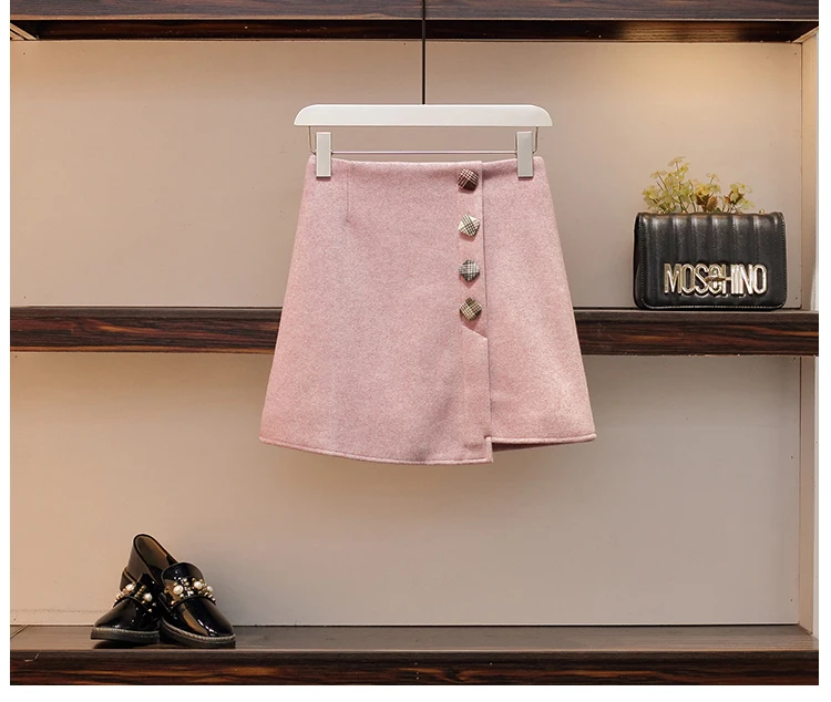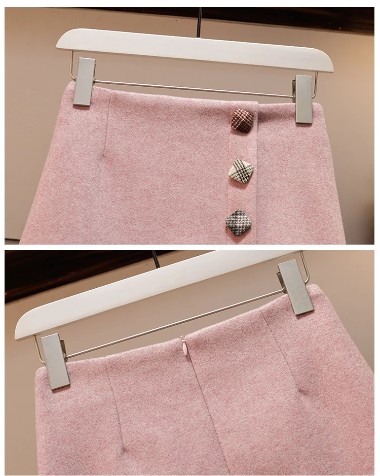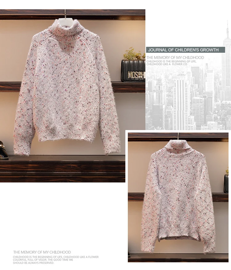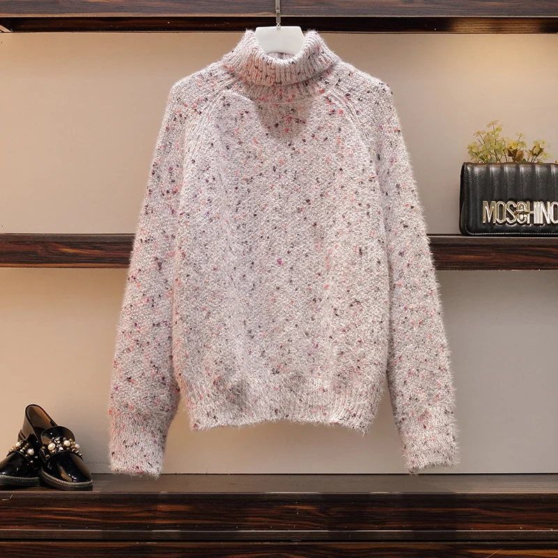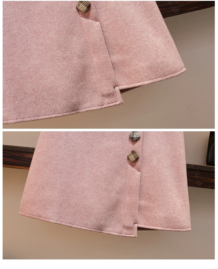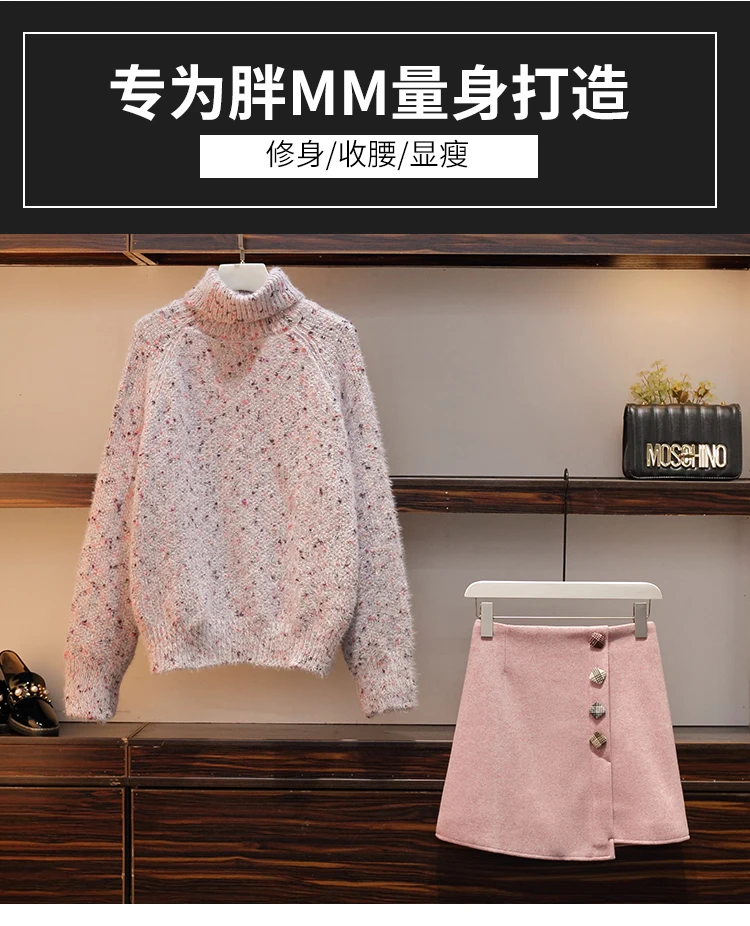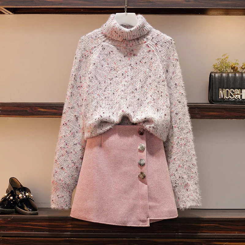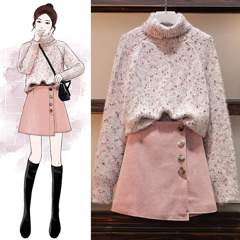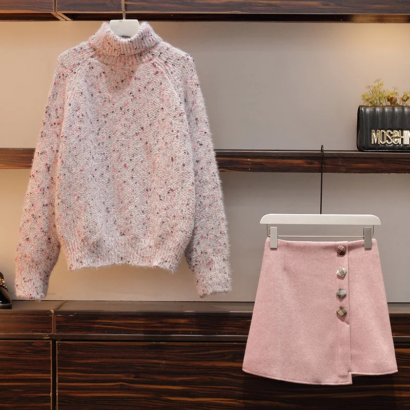 Женский трикотажный костюм большого размера, свитер с воротником-хомутом и розовая юбка на пуговицах, комплект одежды из двух предметов для осени и зимы