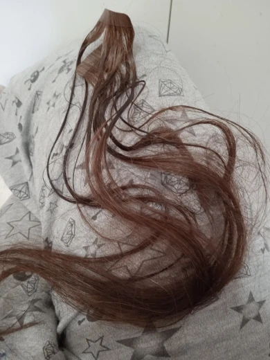 волосы отличные только пришли короче на много чем прошлый раз но качество лучше,очень довольна спасибо,положили в подарок 2 прядки белых волос,очень приятно спасибо большое,буду и дальше у вас заказывать)