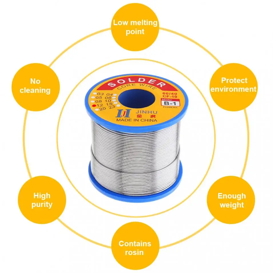 Материалы: олово + свинецВес: 400 г/14,108 унцийДиаметр провода: 1,2 ммПоток Содержание: 2,0%Температура плавления: 210 ℃ / ℉Тип: канифольный сердечникФорма: маленький рулонИспользование: сваркаОсобенности:-Экономичная и практичная, стабильная производительность продукта, безопасна в использовании, удобна в переноске и проста в эксплуатации. Это важный материал для электронных энтузиастов.-Хорошая теплостойкость, сопротивление изоляции, отсутствие брызг и коррозии.-Очистка, антиоксидантная и коррозионная стойкость.-Низкая температура плавления, хорошая активность, яркие стыки припоя, сокращение рабочего времени сварки.-Нет неприятного запаха, меньше дыма, нет токсичных газов.-Область применения: электронные приборы, приборы, бытовые приборы, сварочные компоненты.