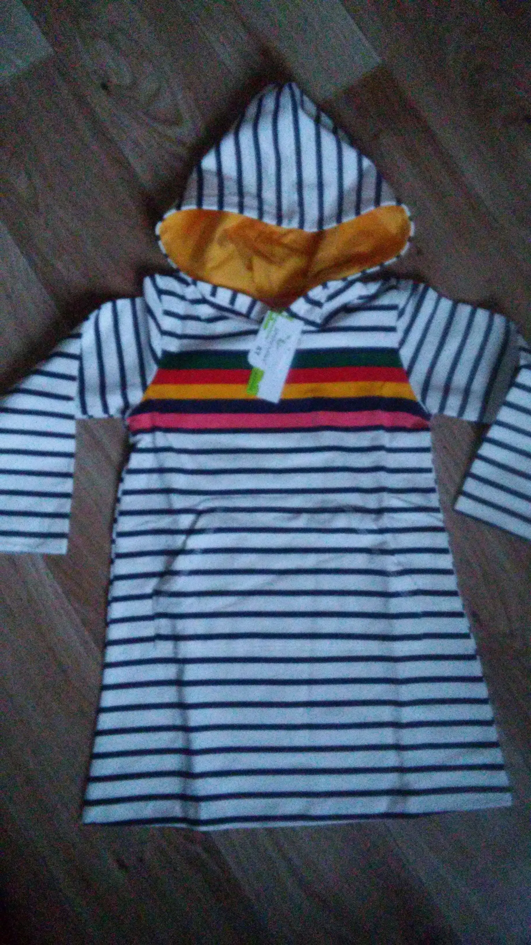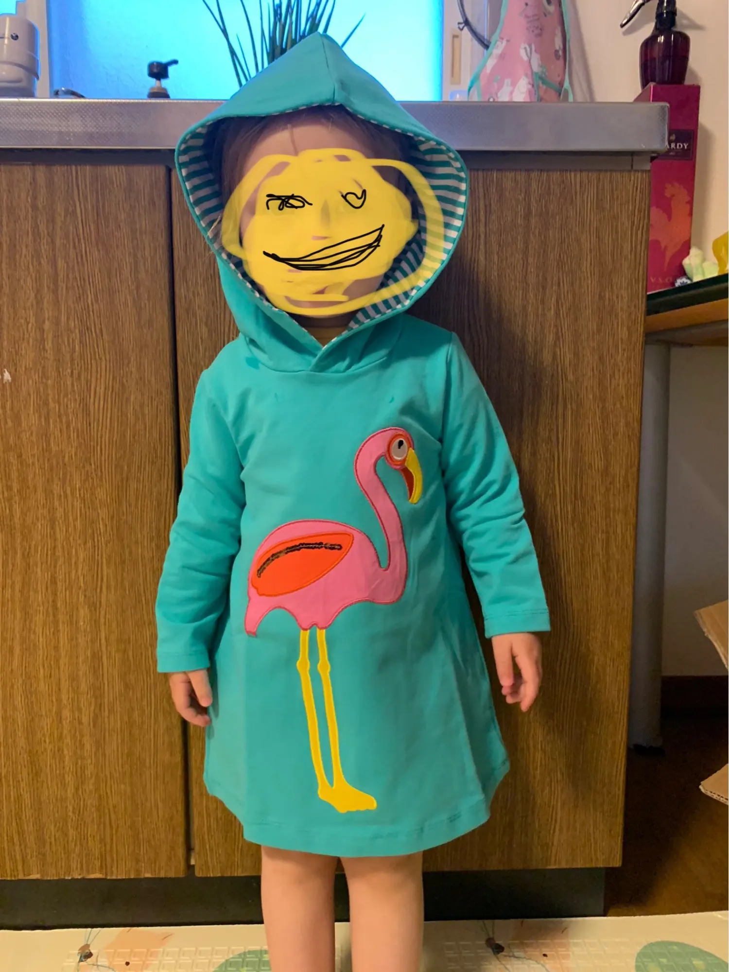 Чудесное качественное французское махровое платье с капюшоном! Моей маленькой леди понравилось! Аккуратно сшито. Цвета такие же яркие и точные, как на фото. Прибыло вовремя Брали размер 7T для 6,5 лет-идеально подходит!