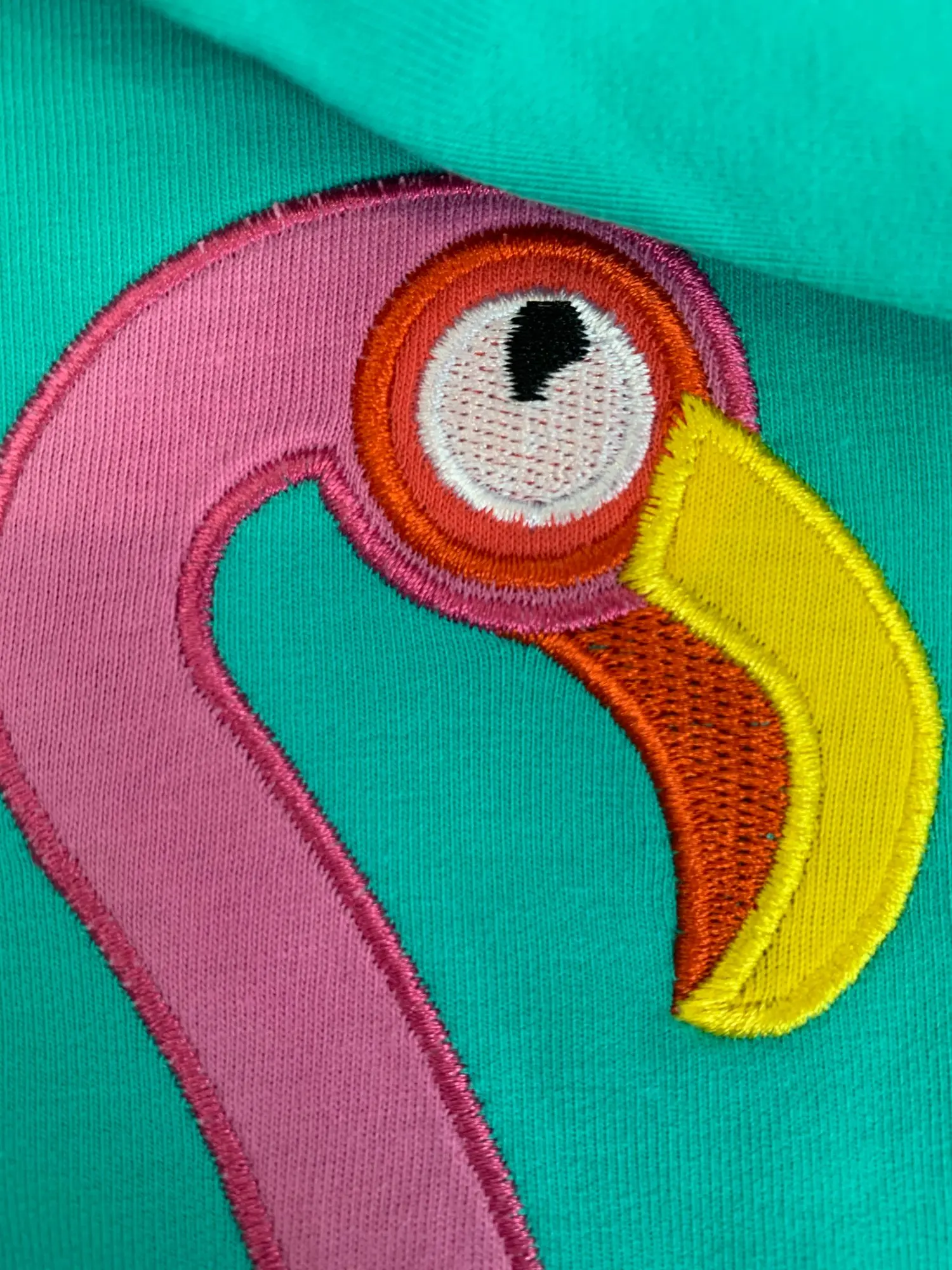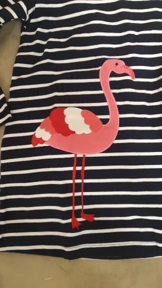 посылка пришла за 3 недели.Качество на высоте, хлопок, швы ровные,нитки не торчат.Единственное надо было на размер больше заказать.Нам 6 лет,заказала размер 6Т, впритык только только носить,хотелось чтобы рукав чуть подлиннее был и длина платья, а так платье супер, цвет салатовый приятный, фламинго пришит аккуратно, всё супер!