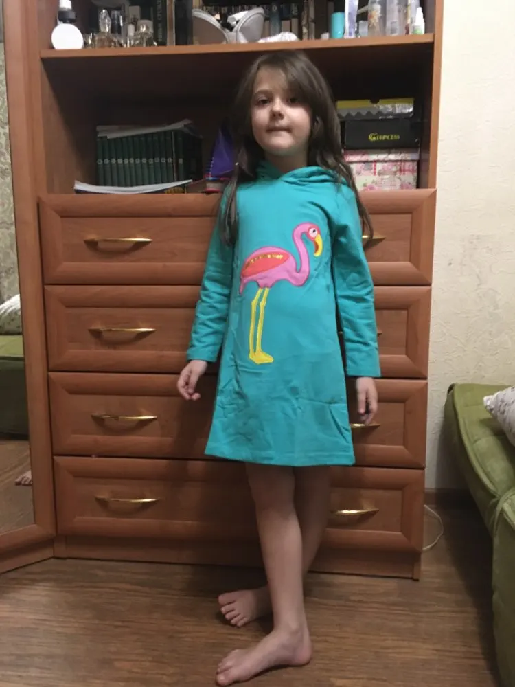 Хорошее платье. Материал как для толстовок, отлично для улицы в прохладную погоду летом. Небольшое расстройство с цветом: у продавца яркая бирюза, по факту скорее зелёное (фото не удалось сделать нормально). В размер. 4Т на 97 см роста по колено где-то, весной будет как раз (неполные 4 года).