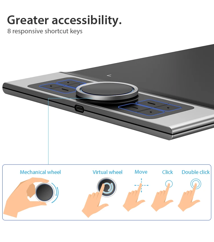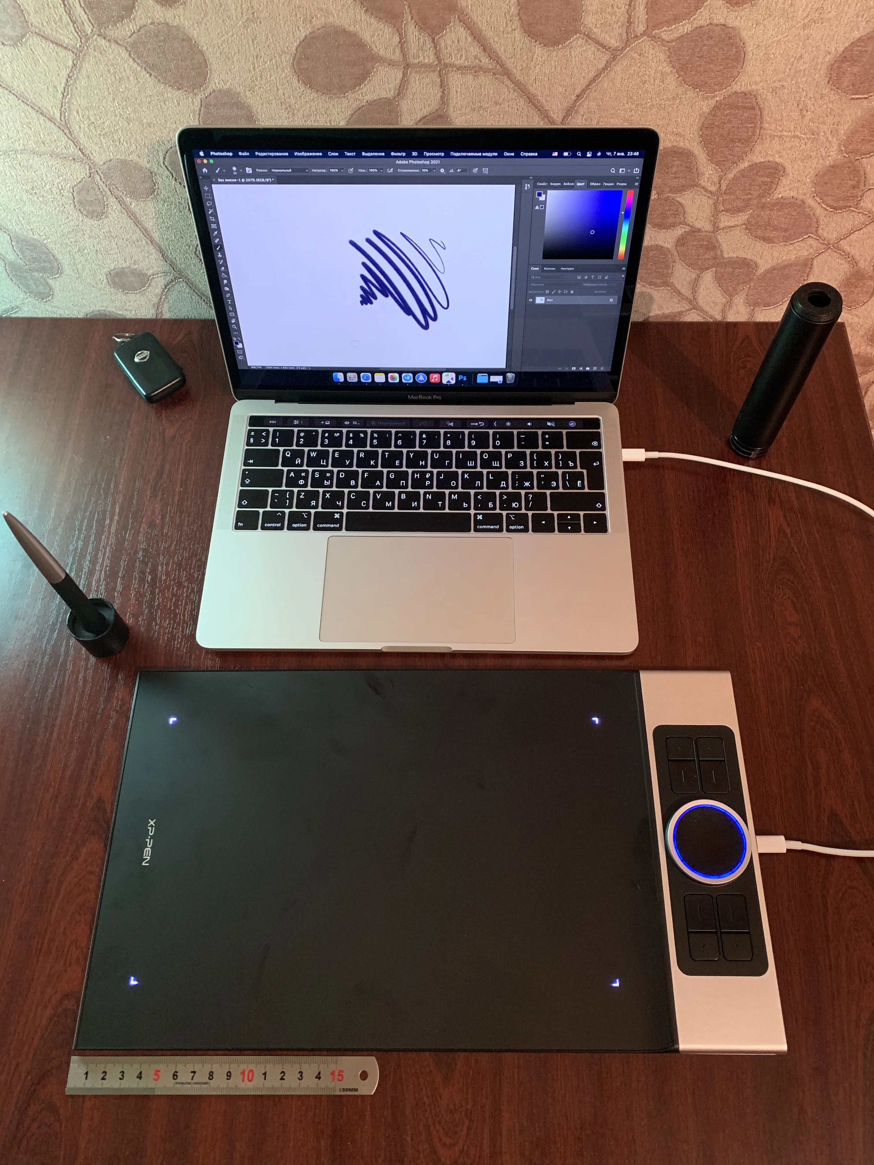Планшет понравился, всё настраивается. Колёсико зачёт. Поверхность рабочей области- тактильный экстаз. Из минусов - прямые руки в комплект не входят, нет базовой защитной пленки в комплекте, пришлось докупать сразу. В остальном будем пробовать и экспериментировать - планшет современный, позволяет раскрыть потенциал.