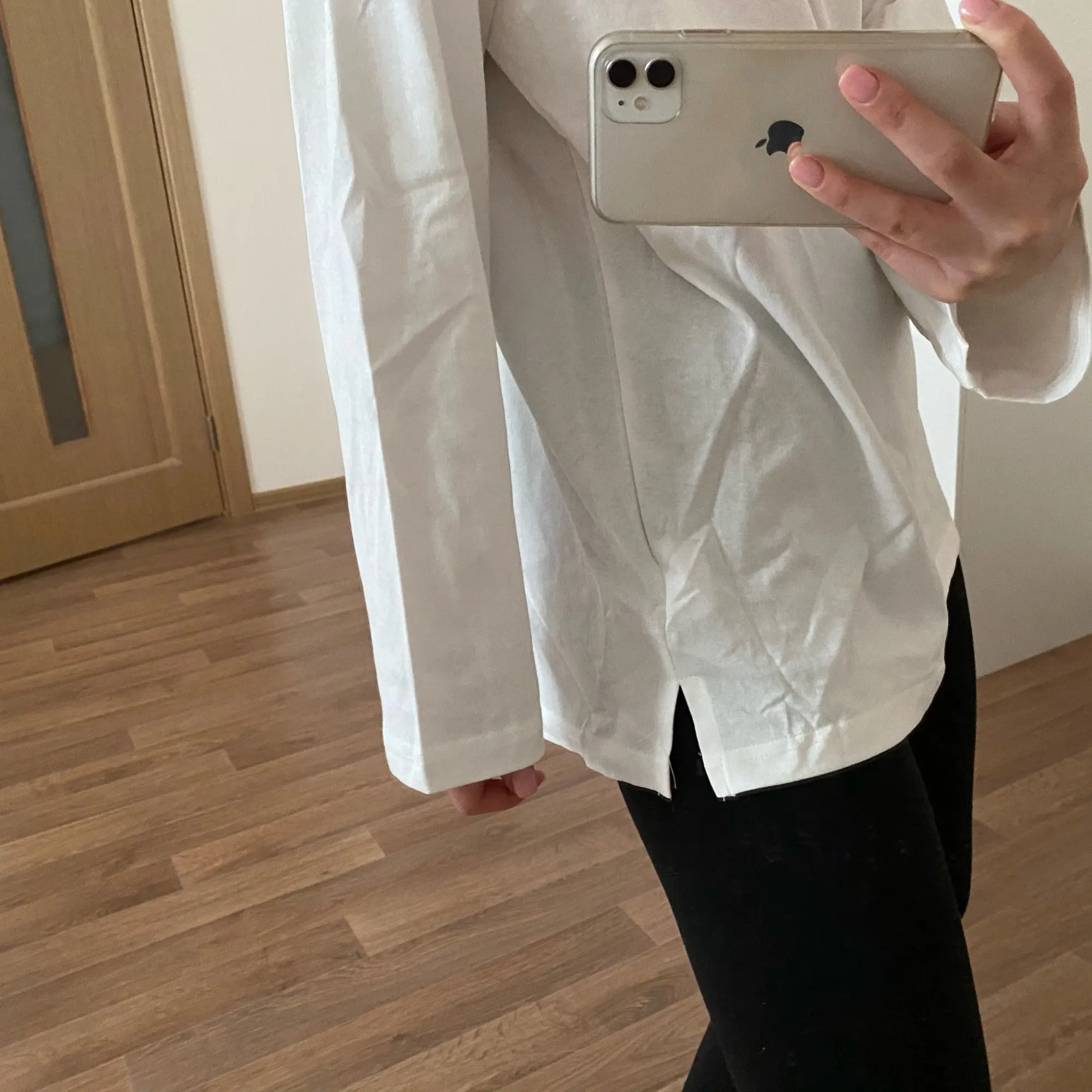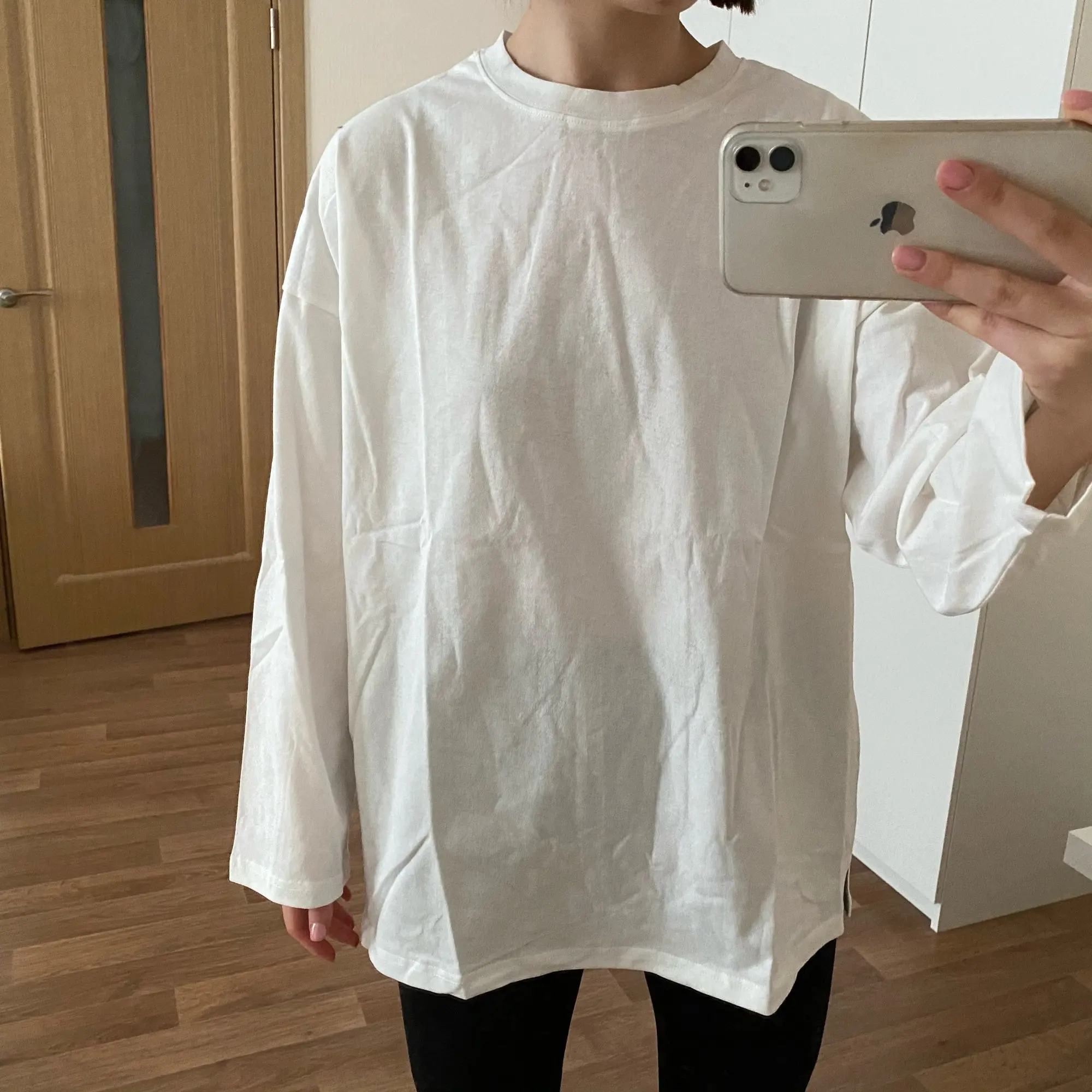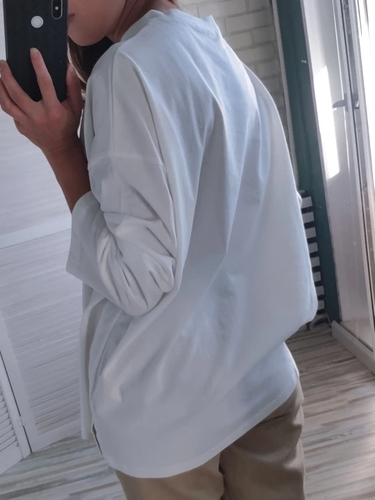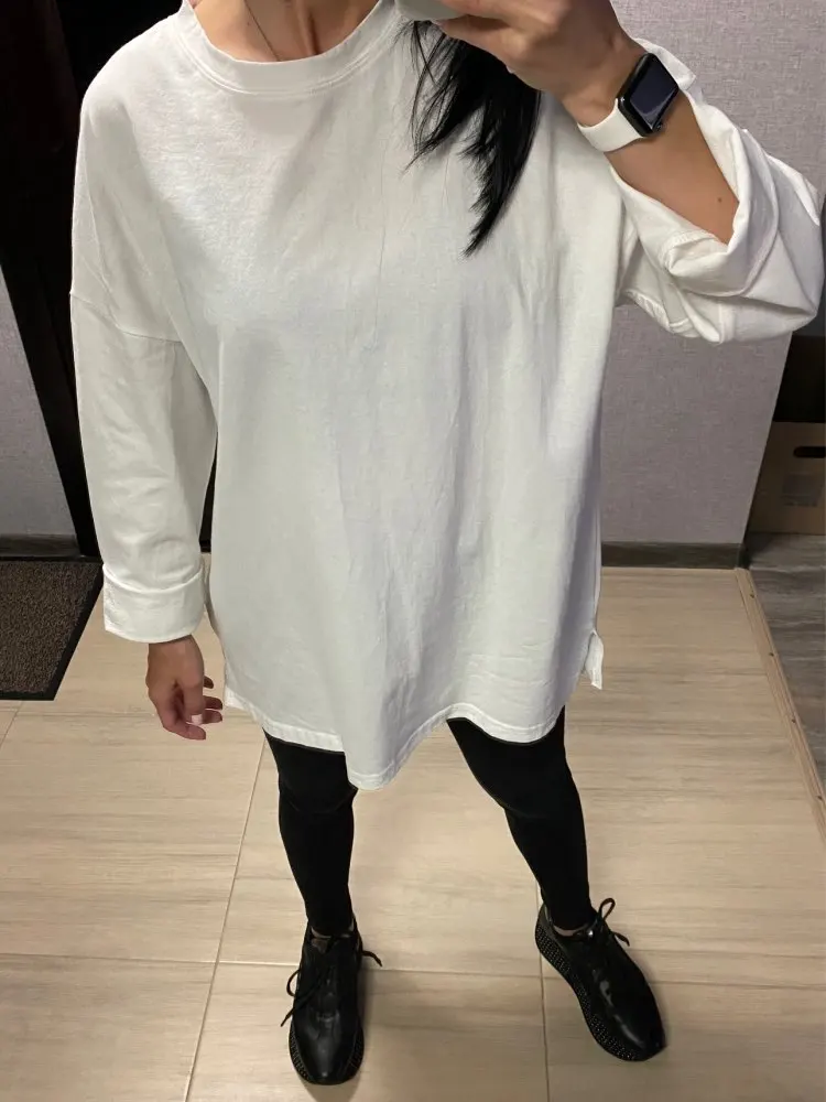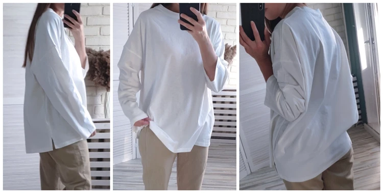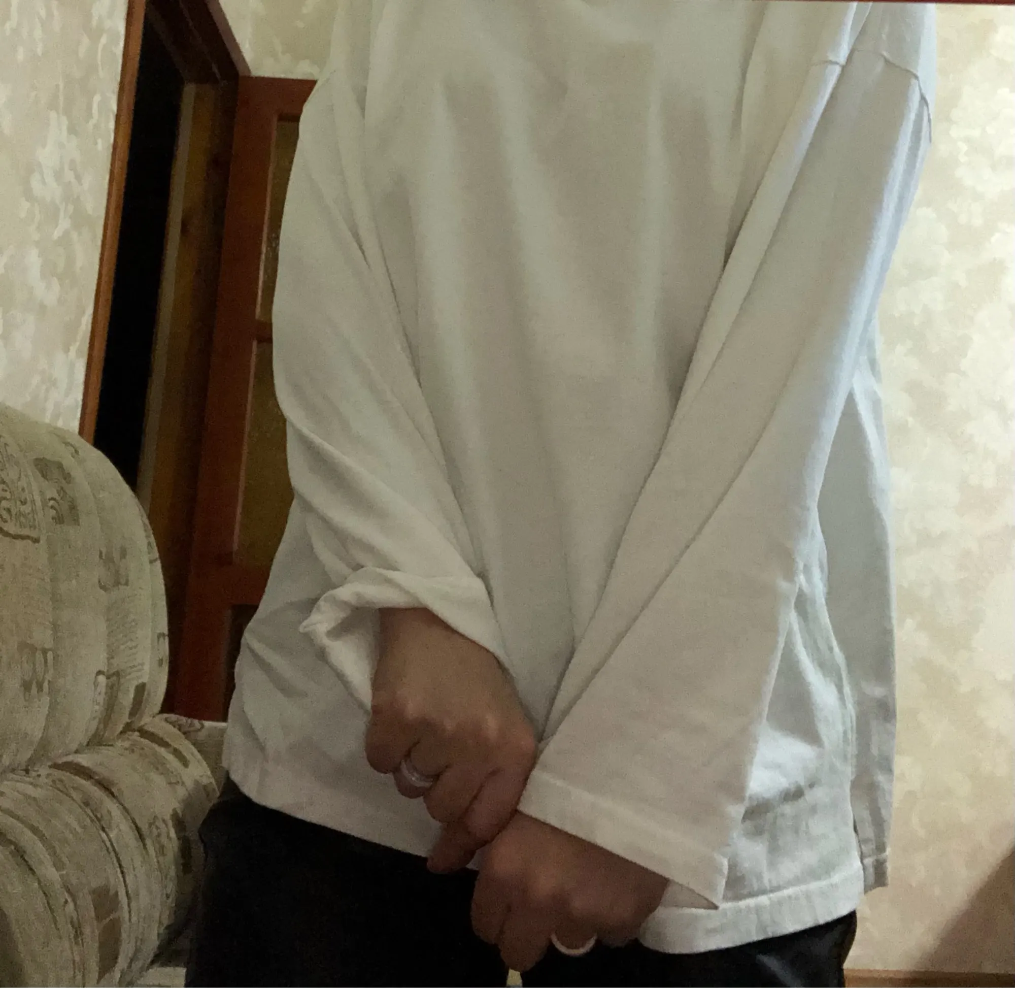 заказала два лонгслива разного цвета, пришли разные по длине и ширине, так же на небесном нет разрезов сбоку и он менее плотный. но в целом, качество и того и другого меня полностью устроило - плотный хлопок, хороший оверсайз с правильным спущенным плечом. фото на рост 165, ношу размер одежды xs-s