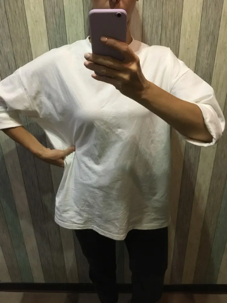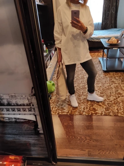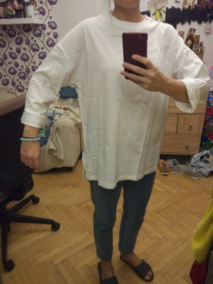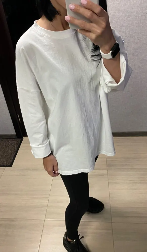 Футболка пришла молниеносно. Качество чистый хлопок, размер оверсайс. Сидит супер! Всем советую этот товар. Взяла в 3 цветах, не пожалела, базовая вещь