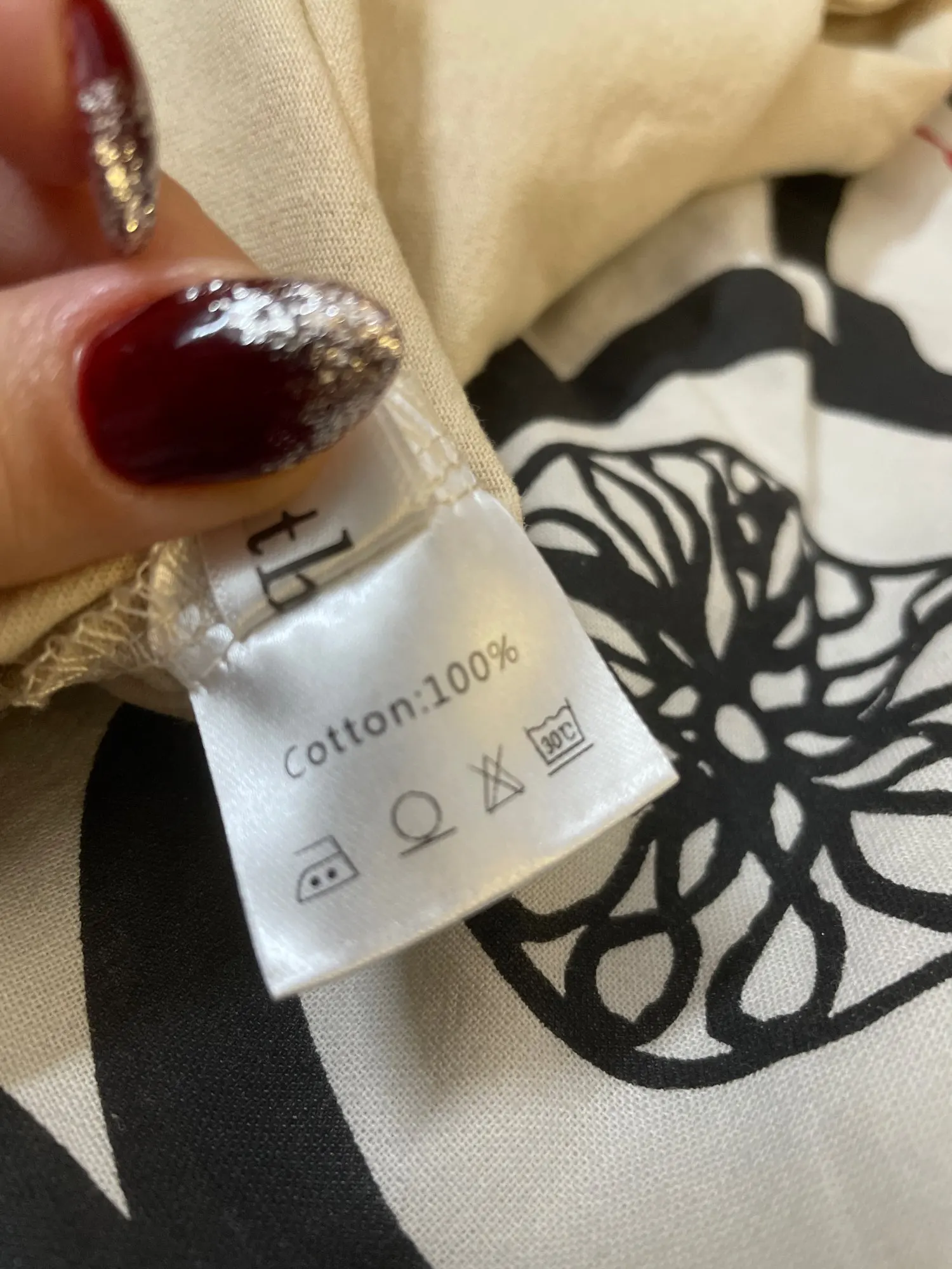 Очень приятная майка. Простая. На этикетке указано 100 % cotton, и на ощупь это реально чувствуется. Цвет бежевый немного бледней, чем на фото. На мой размер 48, рост 174 смотрится немного оверсайз. Рукав впритык. Мне понравилась. Дошла в Мск за 3 недели. Упакована аккуратно, в подарок резиночка для волос. Всем довольна, продавца рекомендую.