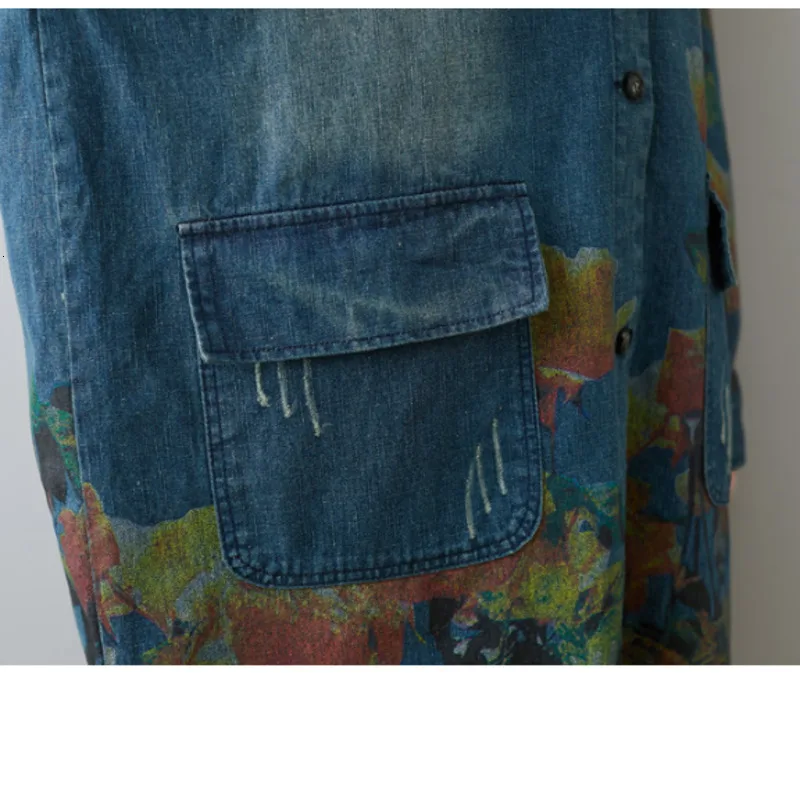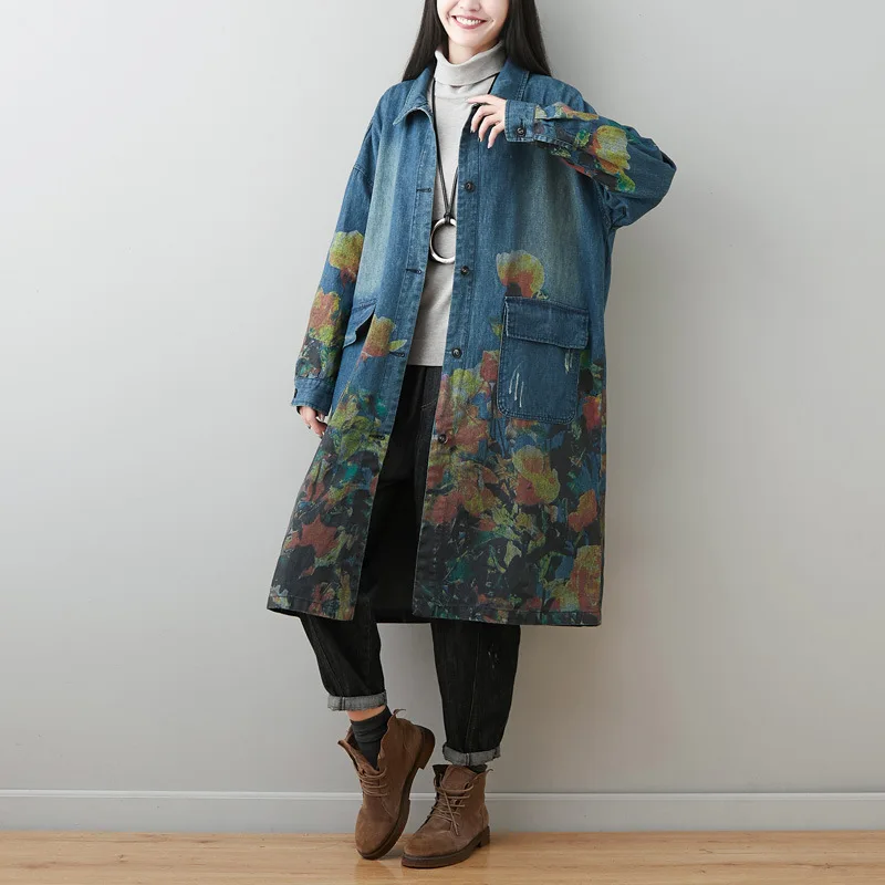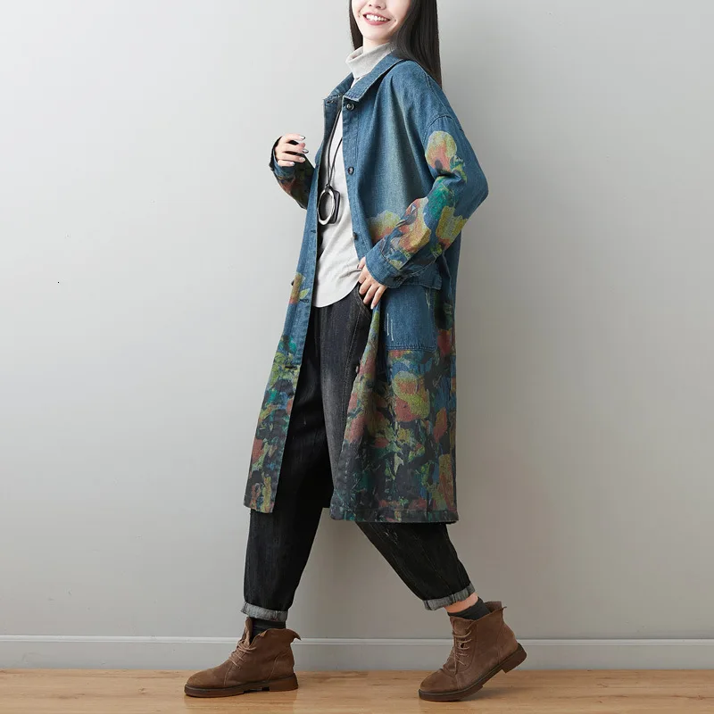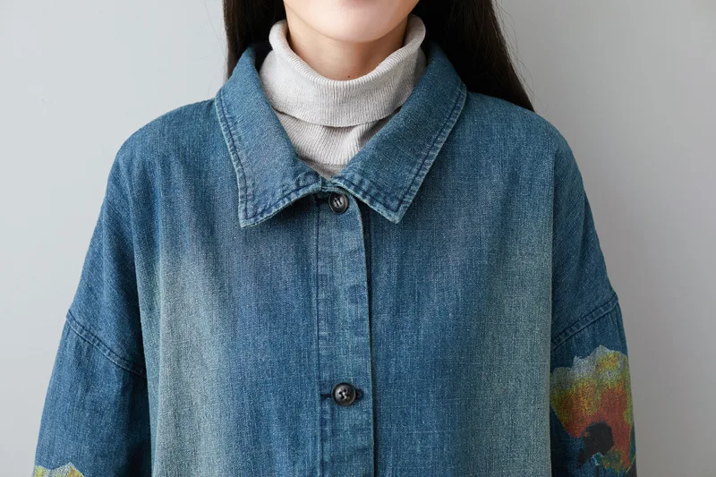 Женская джинсовая ветровка большого размера, длинная верхняя одежда в ковбойском стиле, однобортные свободные джинсы с принтом