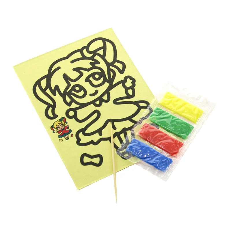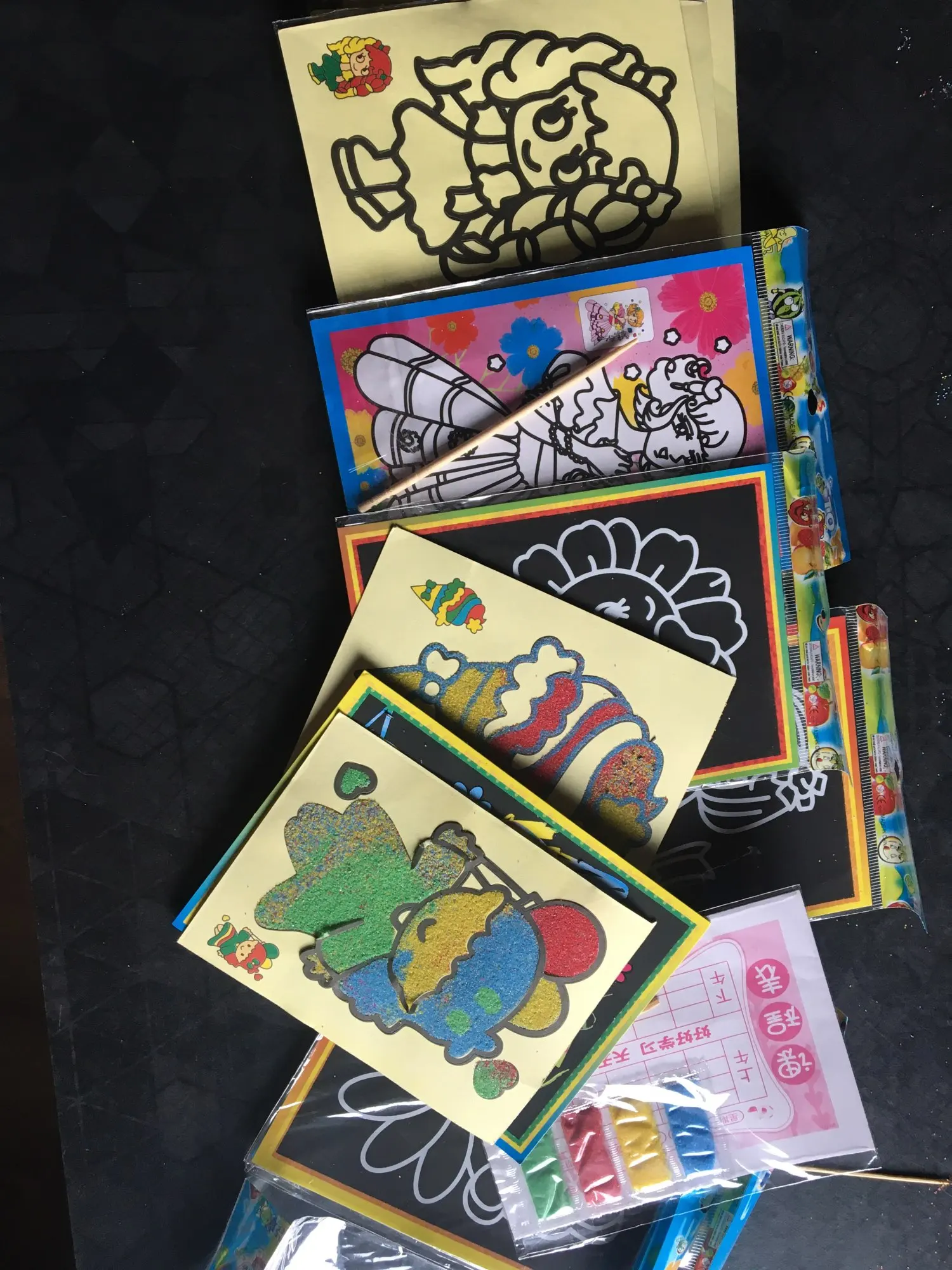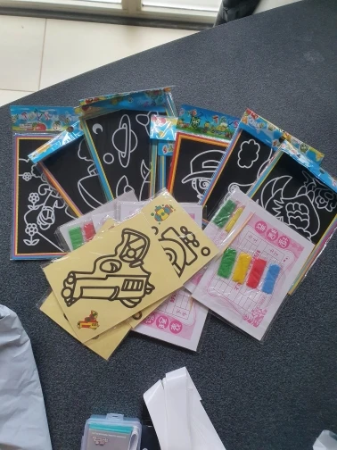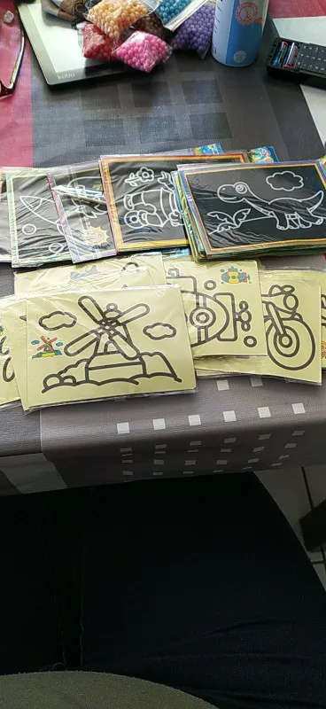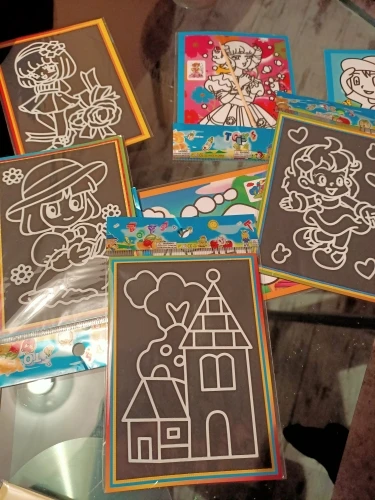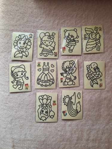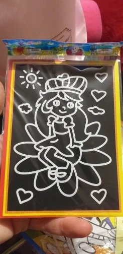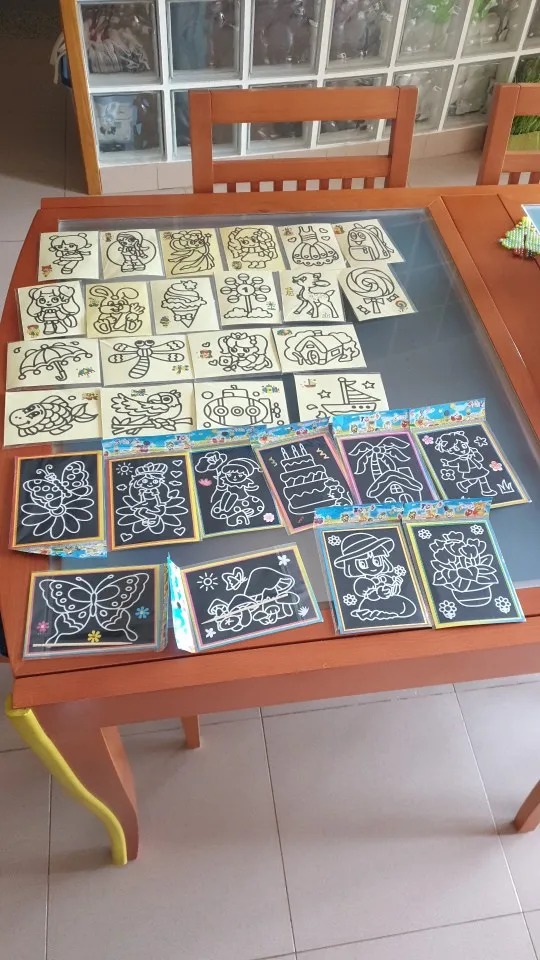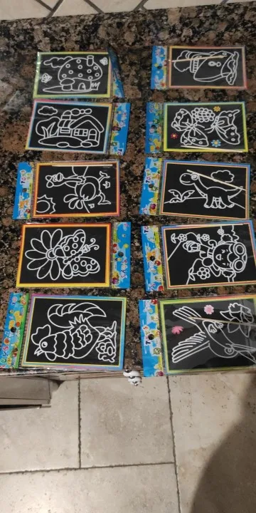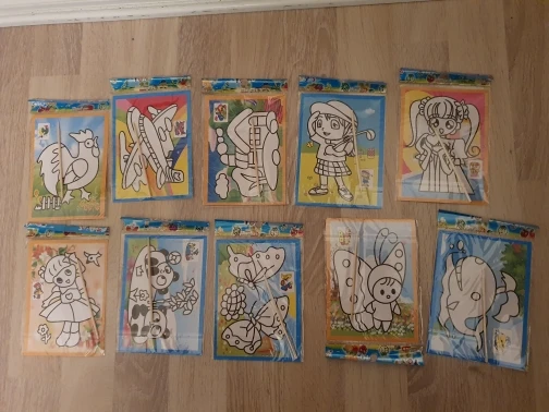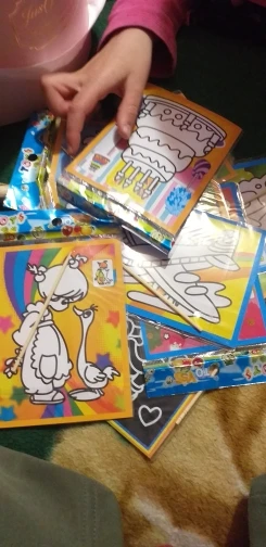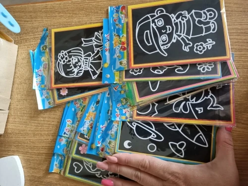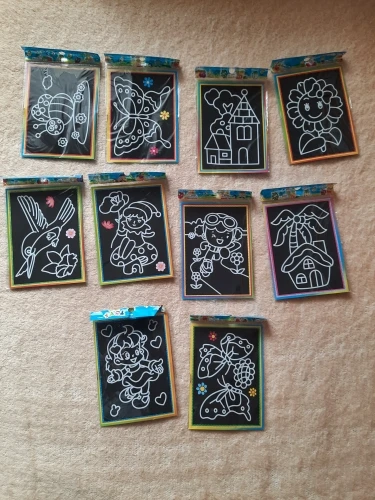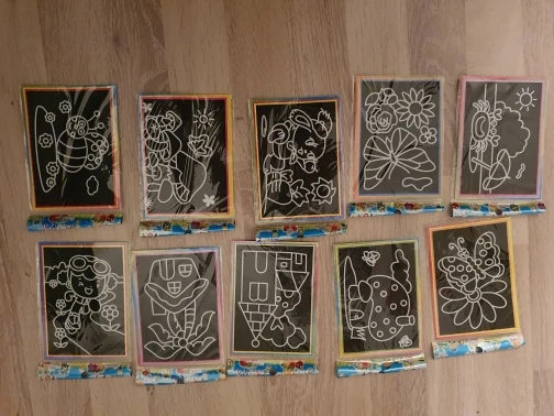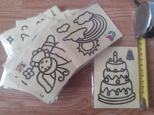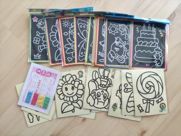 Картинки очень маленькие. по размеру, как в описании. Черные, которые царапать, чуть больше по размеру. В принципе, песка в комплекте хватает для полной картинки. Если ребенок маленький, рекомендую поискать чуть побольше размер, т.к. самому сложно острой зубочисткой убрать верхний слой, чтоб засыпать песком.