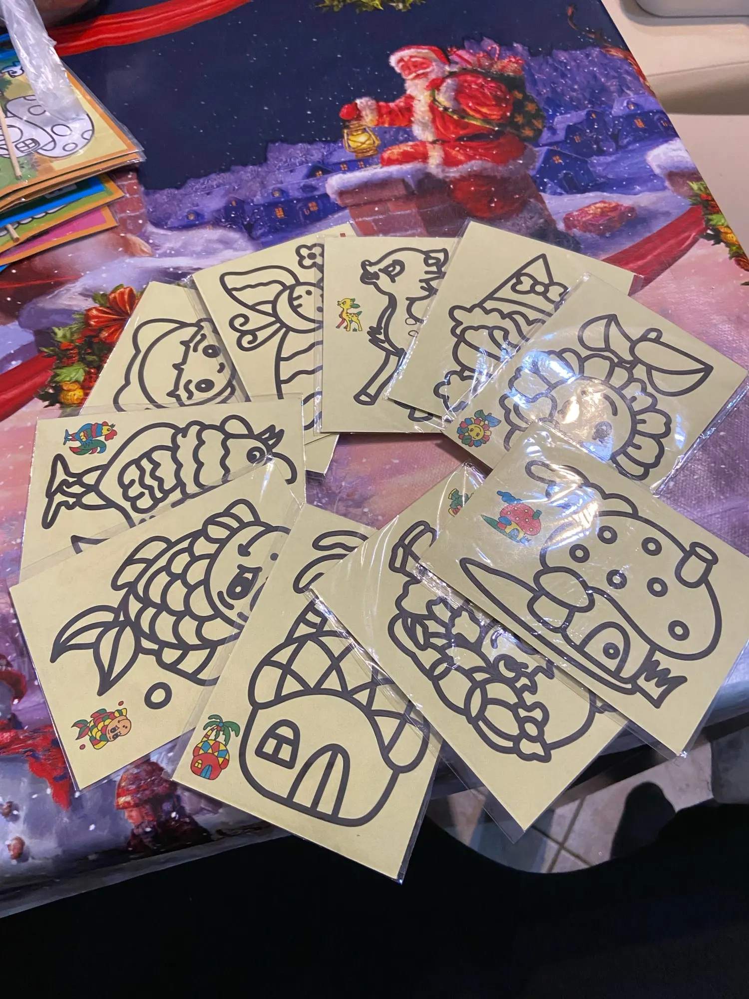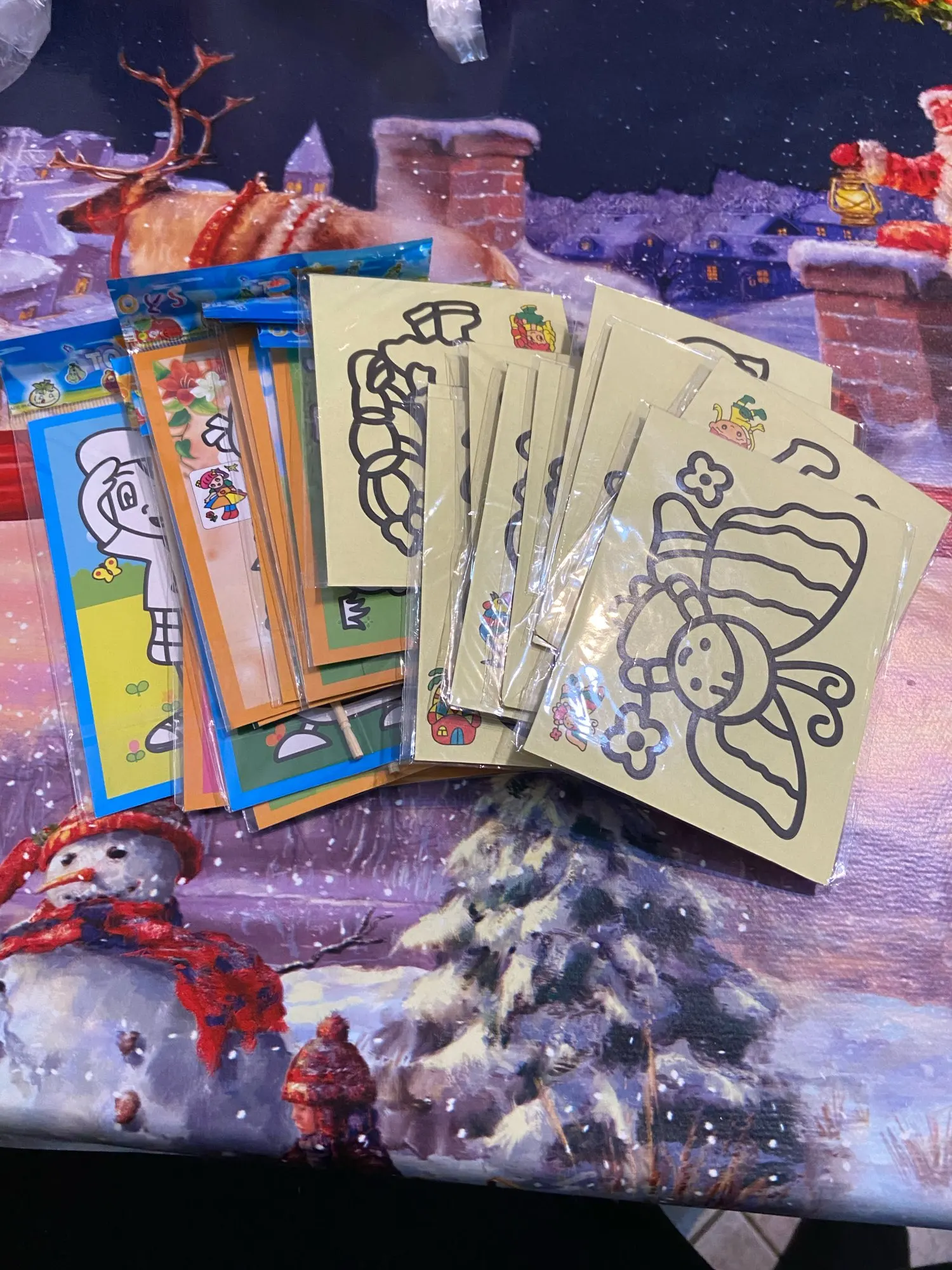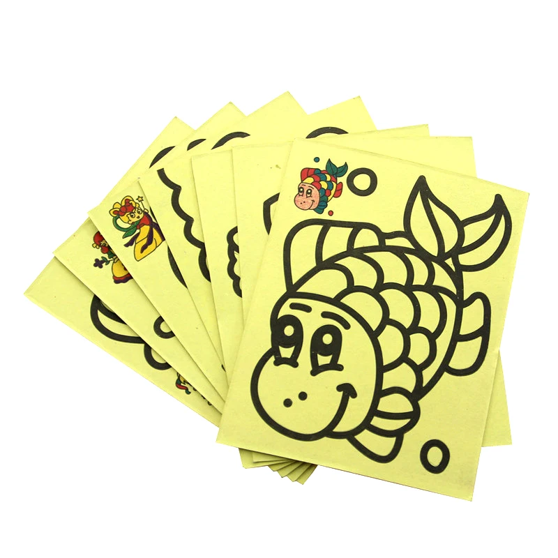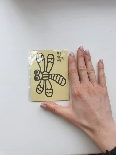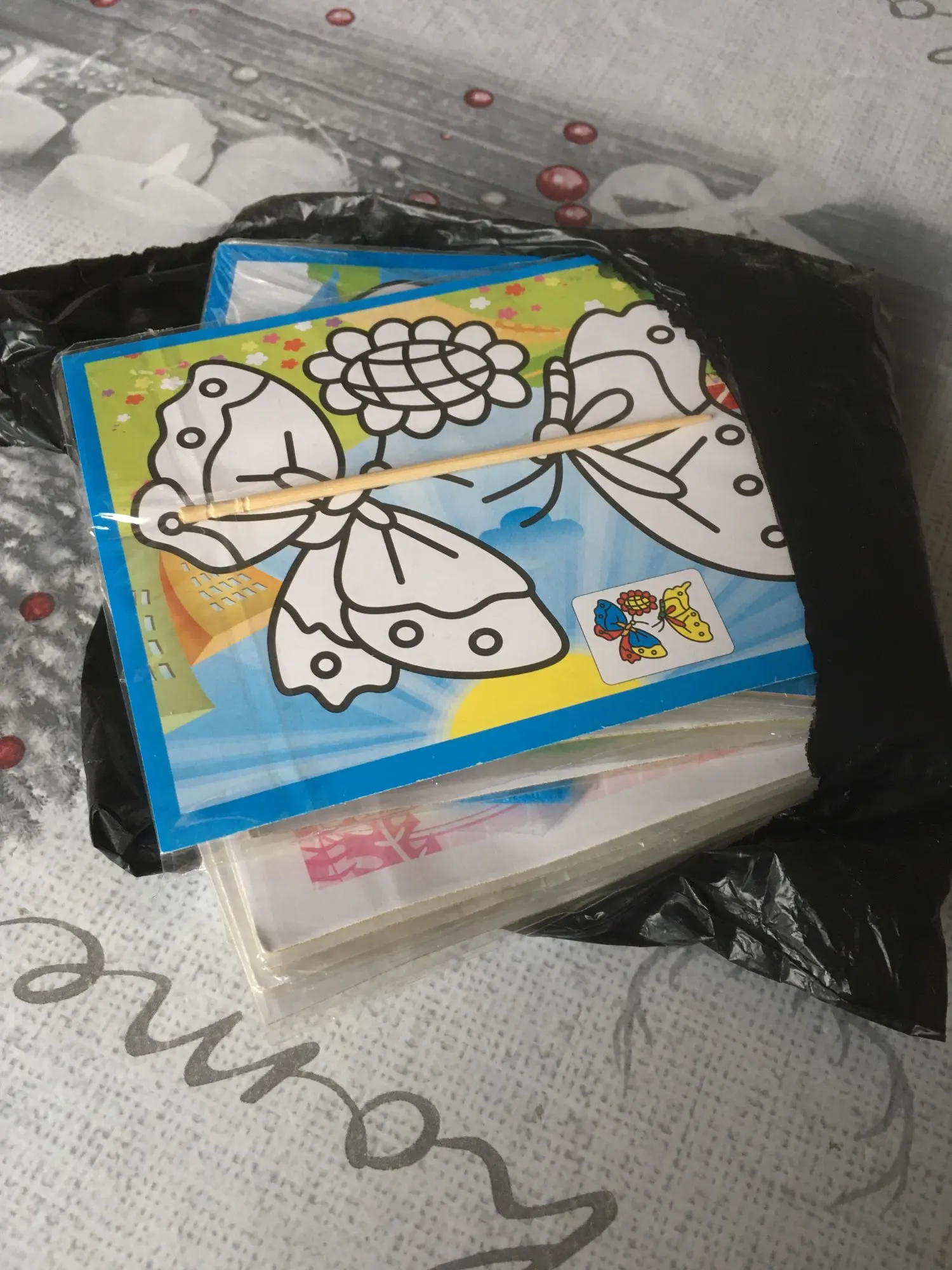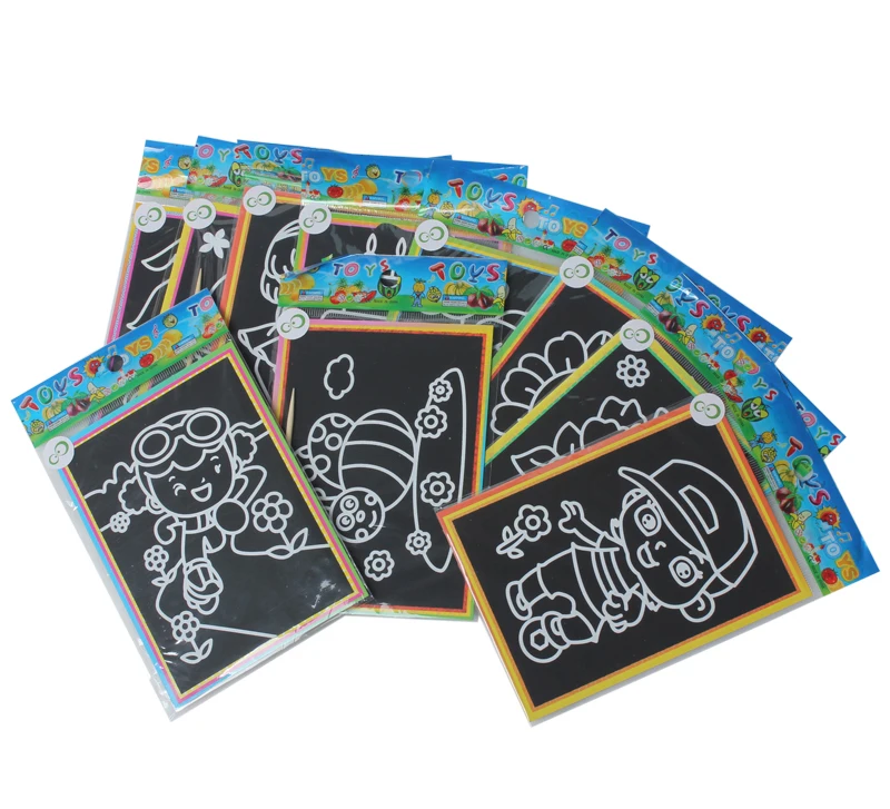 Картинки очень маленькие. по размеру, как в описании. Черные, которые царапать, чуть больше по размеру. В принципе, песка в комплекте хватает для полной картинки. Если ребенок маленький, рекомендую поискать чуть побольше размер, т.к. самому сложно острой зубочисткой убрать верхний слой, чтоб засыпать песком.