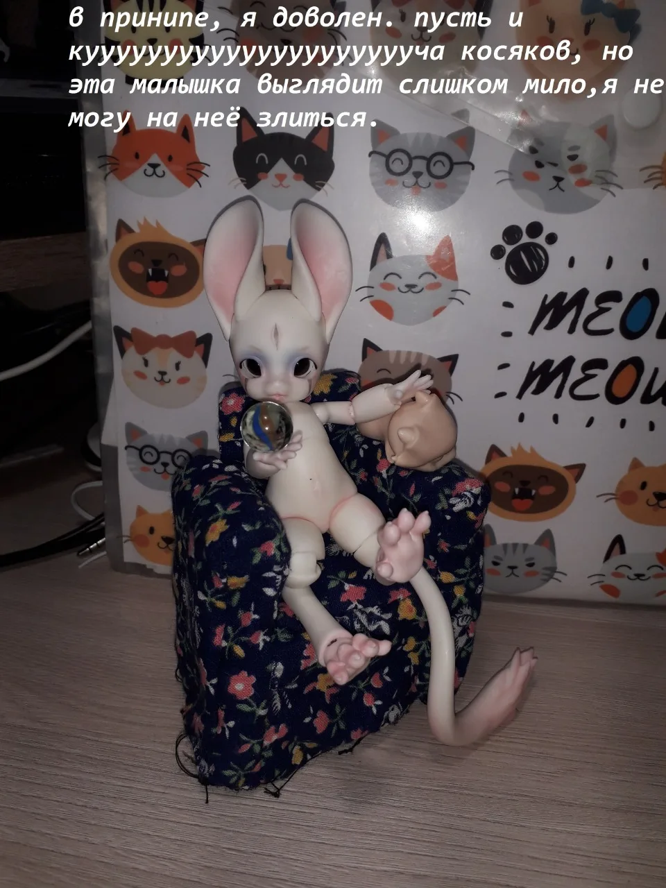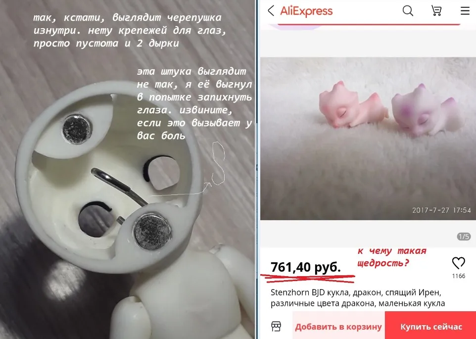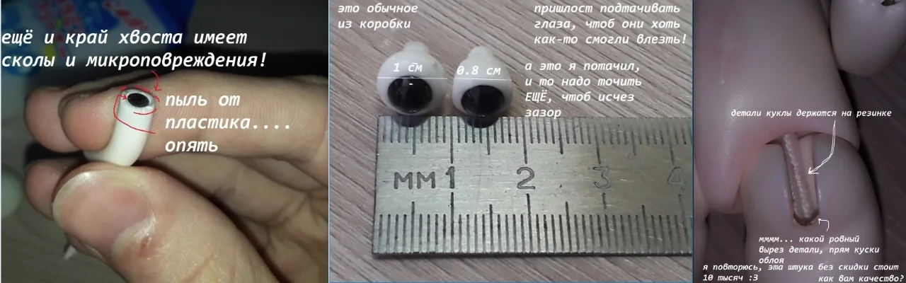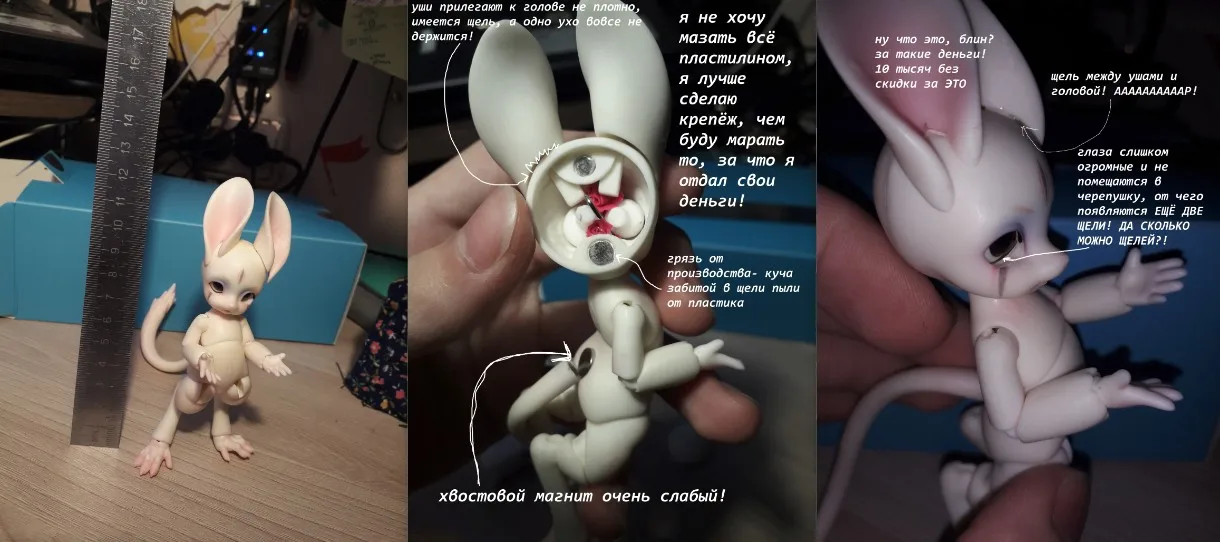 Мне больно писать этот обзор. посылка пришла быстро, за неделю-2. Купил по скидке. Просил покрасить её как на картинке, но этого не сделали, зато положили тот цвет глаз и хвост. в подарок шёл дракон, кусок пластилина и губка. подвижность средняя. кукла не шарнирная, а на резиночках; у рук и ног мало положений что усложняет расстановку в разные позы. под силой резинки и весом куклы конечности сокращаются в исходное положение. хвост держится плохо- слабый магнитик, да к тому же на кончике хвоста у этого магнита есть маленькие сколы пластика. одно ухо не держится, пришлось наносить слои лака. тыл головы открывается, чтобы вставить и регулировать глаза, но ОНИ НЕ ВЛЕЗАЮТ! они слишком огромные. обращались к продавцу с проблемой о слишком больших глазах, но он втирает, что они нормально размера, и переубедить его не получилось. если вы рукастый и сможете исправить все неполадки- то брать можно.