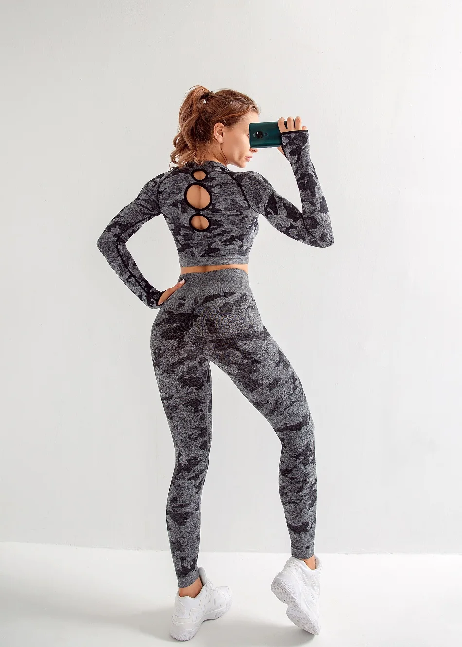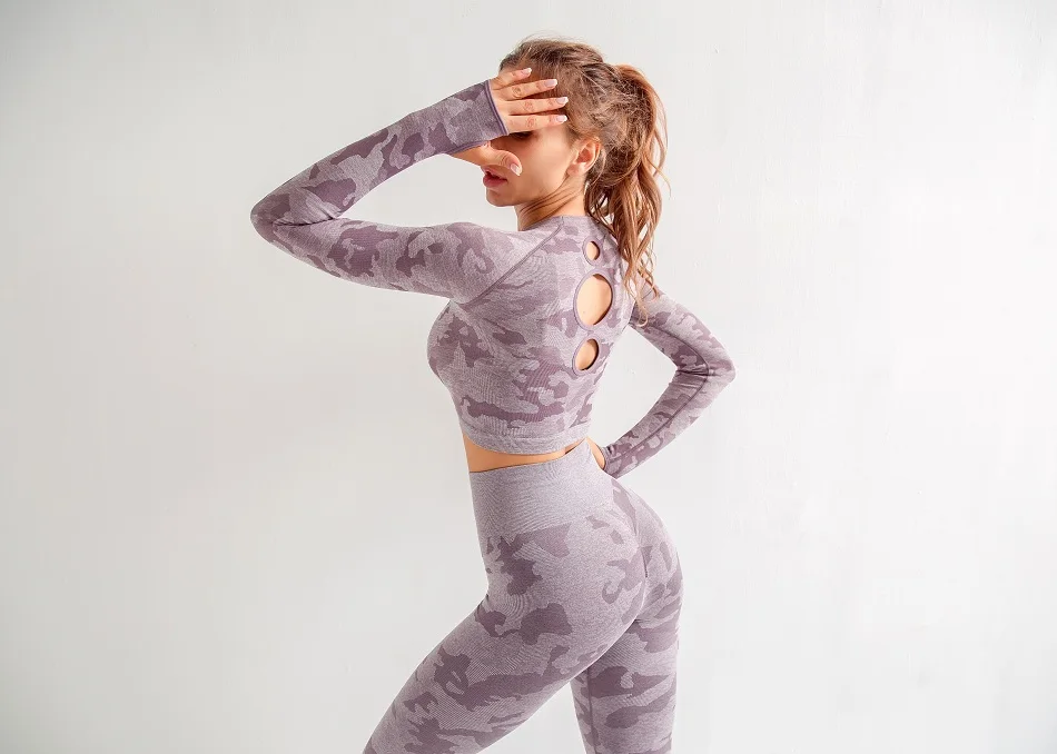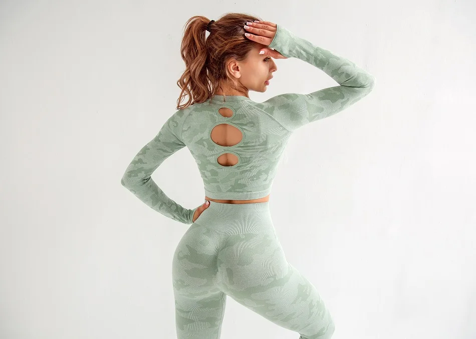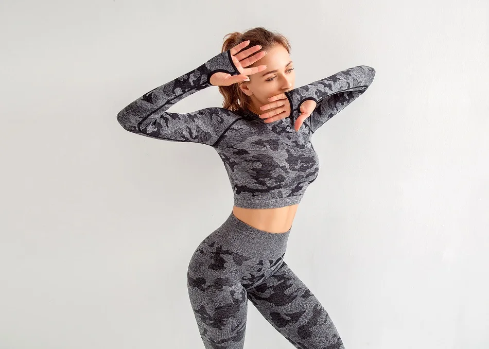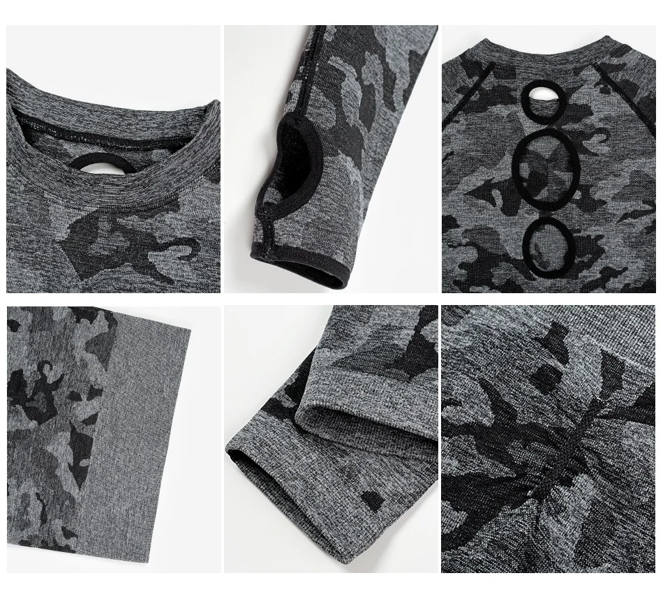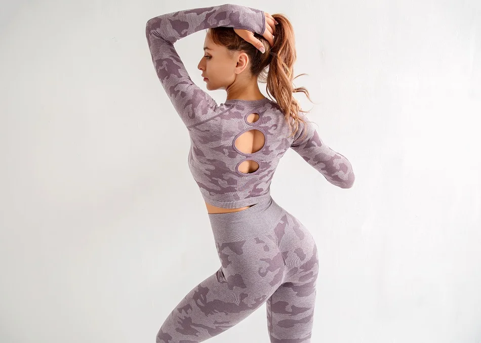 Женские комплекты для йоги, рубашка с длинным рукавом и бесшовные леггинсы, камуфляжный спортивный костюм, спортивная одежда для бега, фитнеса, zf288