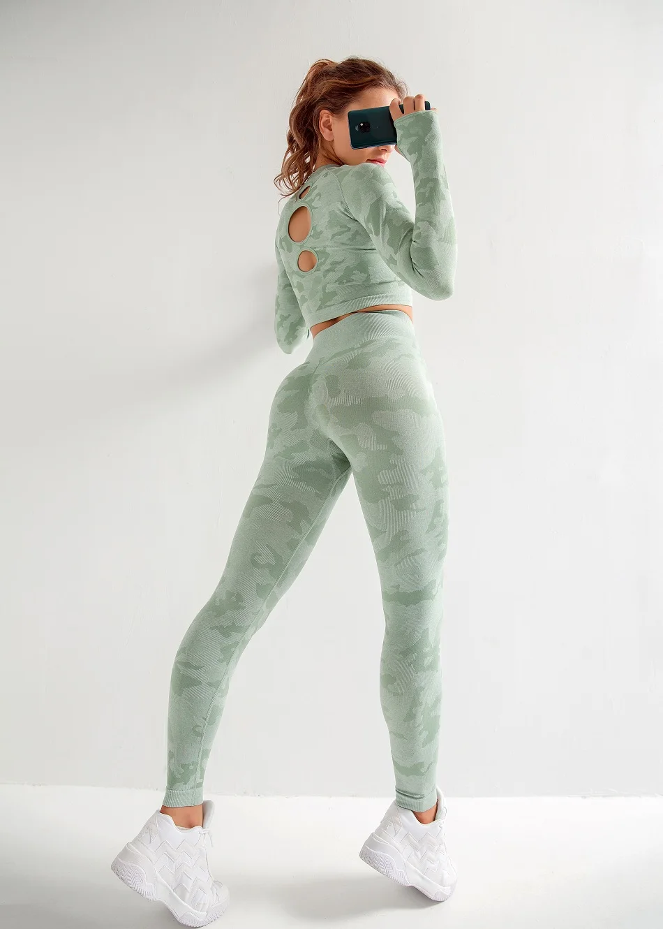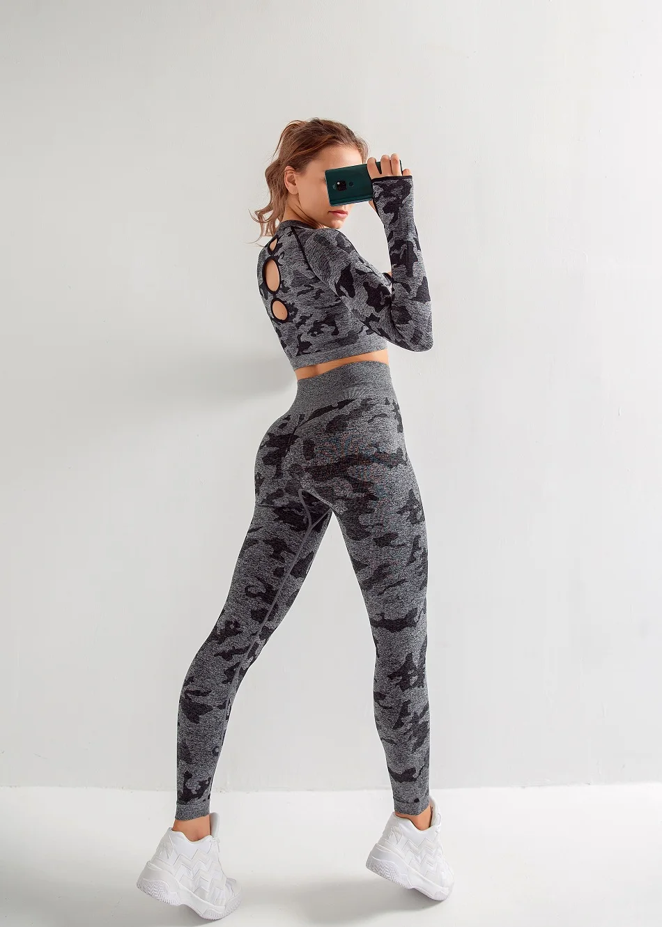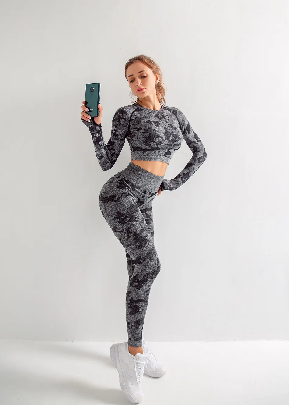 Женские комплекты для йоги, рубашка с длинным рукавом и бесшовные леггинсы, камуфляжный спортивный костюм, спортивная одежда для бега, фитнеса, zf288