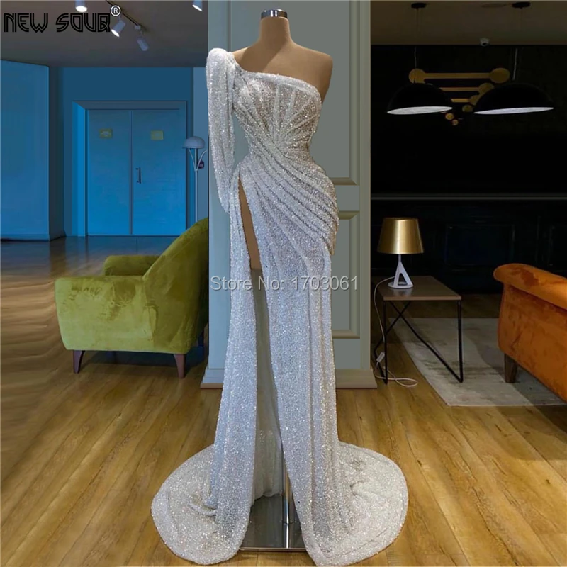 Длинные вечерние платья на одно плечо с высоким разрезом, модель 2020 года