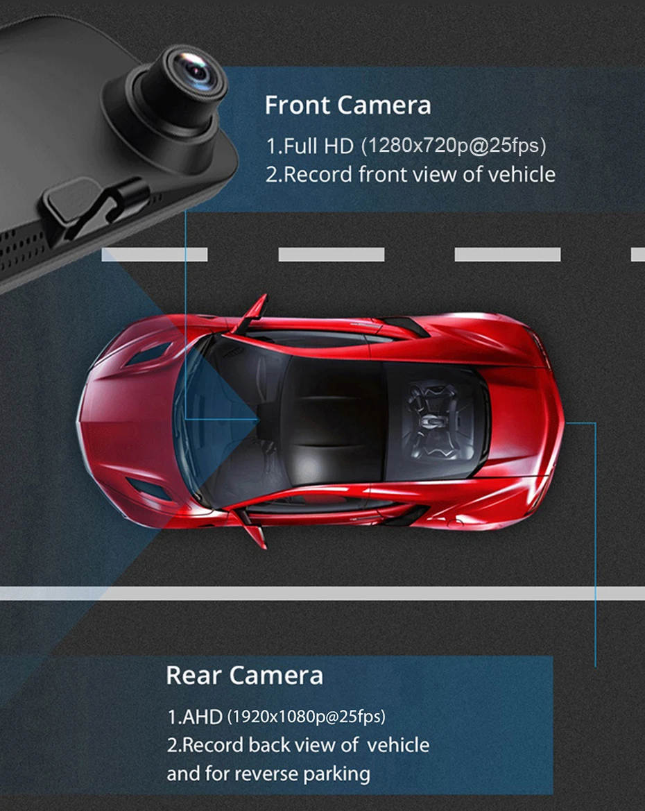 Это устройство поставляется с двумя широкоугольными камерами и может использоваться для передней и задней частей вашего автомобиля. Две HD камеры могут одновременно записывать каждый мимолетный момент.