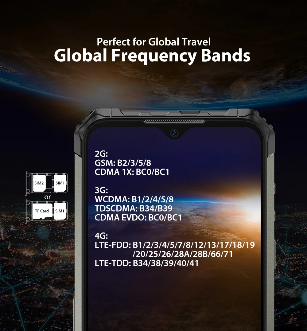 2G GSM: 1900/1800/850/900(B2/3/5/8) 3G WCDMA: B1/2/4/5/8(2100/1900/1700/850900) 3G CDMA EVDO: BC0/BC1(800/1900) 4G LTE-FDD: b1/2/3/4/5/7/8/12/13/17/18/19/20/25/26/28A/28B/66/71(2100/1900/1800/1700/850/900/700/750/700/850/850/800 /1900/850/700/700/700/850/700) 4GLTE-TDD: B34/38/39/40/41 (2015/2500/1900/2300/2500)
