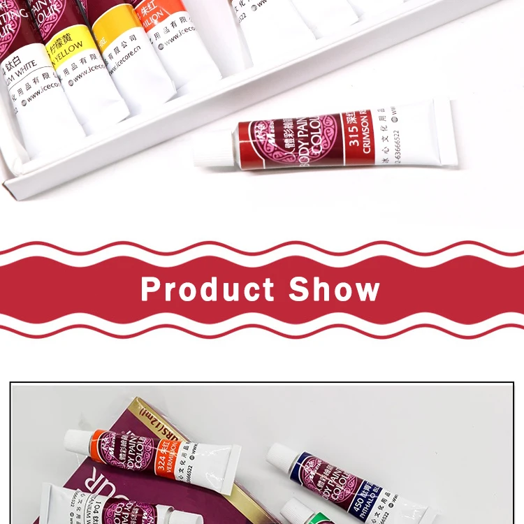 Особенности: извлекается из растительного пигментного экстракта, натуральный для здоровья сырья, безопасен и нетоксичен. Светильник Кая и шелковая текстура, близко к поверхности кожи, отражает высококачественные яркие цвета, водостойкость и защита от пота, без макияжа, используется для рисунок для тела и т. д.
