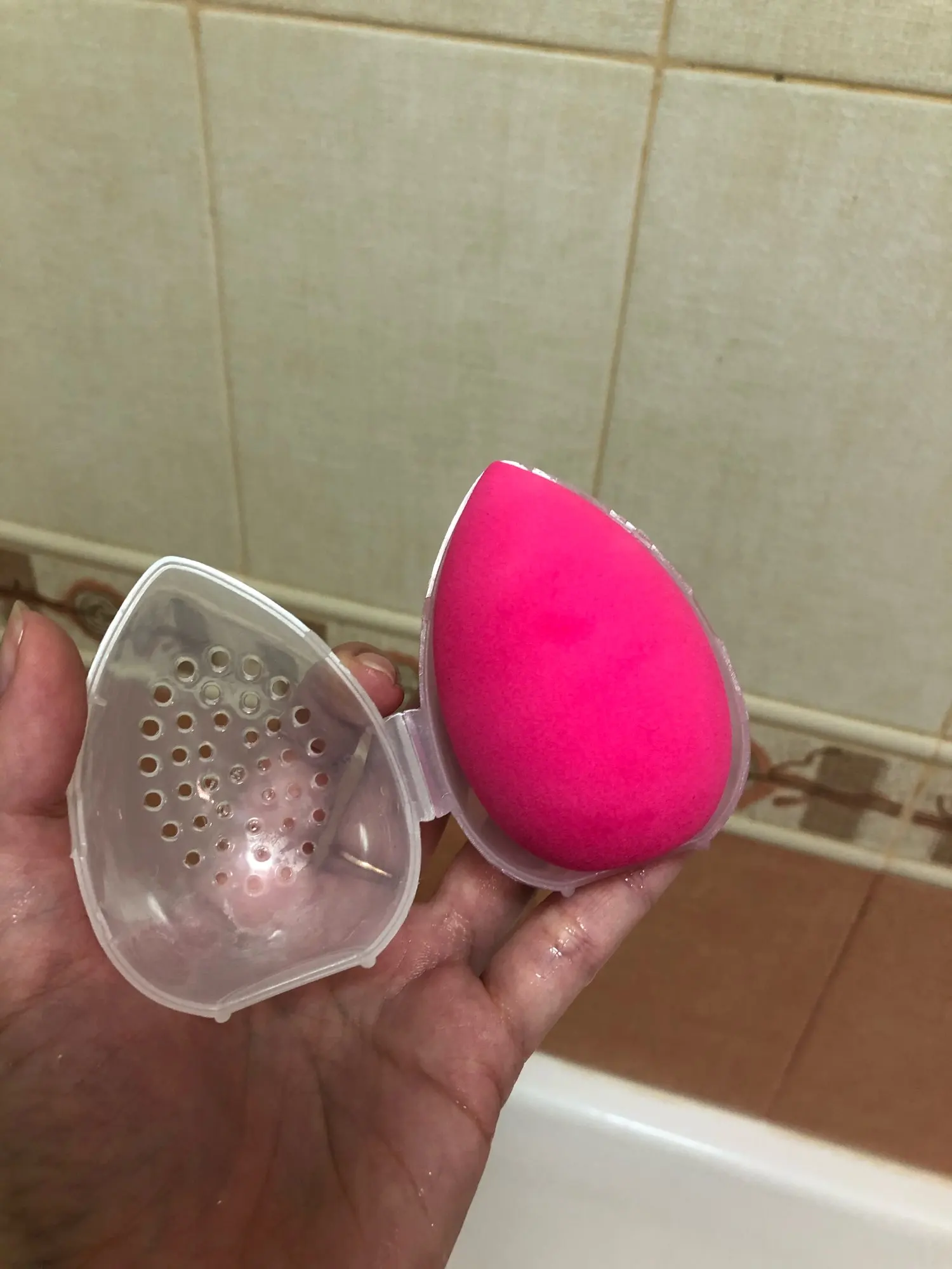 Меньше чем за две недели доставили, молодцы! Очень удобная вещь. Сначала показалось большим, но когда спонж помыла - он разбух и отлично высох в своём яйце, не пачкая предметы рядом. Благодарю!