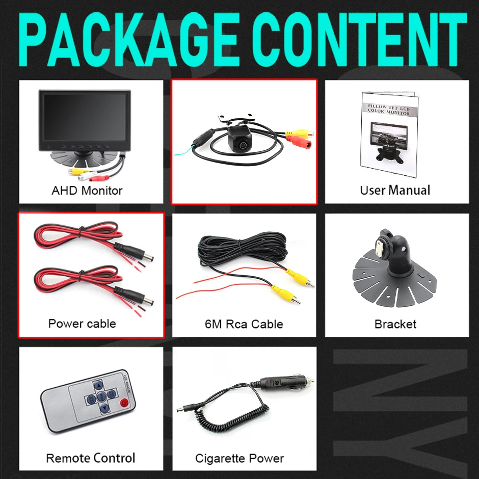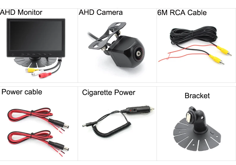 1 х AHD автомобильный монитор1 x камера заднего вида AHD1 х 6 м видео кабель2x1 м кабель питания1 x Кабель питания сигареты1 x кронштейн для установки