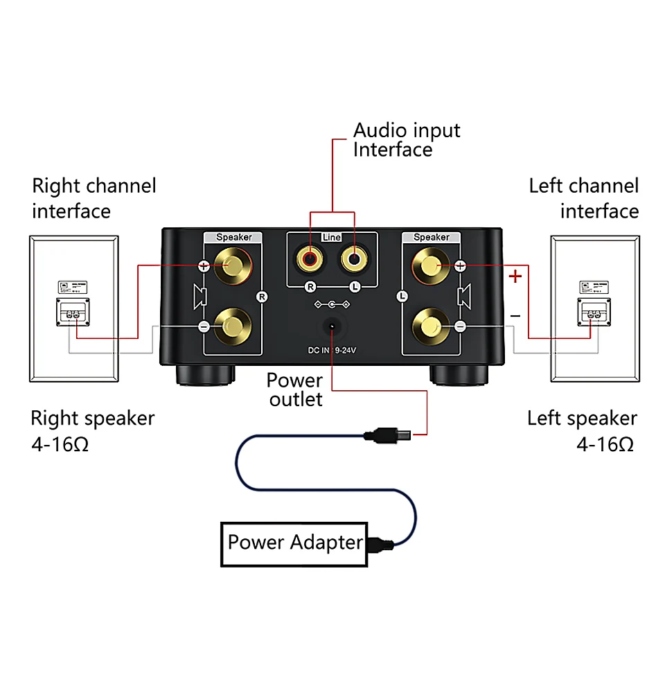 Усилитель мощности-это усилитель мощности с фиксированным сопротивлением. Поддержка пассивного аудио/рога 4/6/8/16 Ом. Он не может быть подключен к компьютерному аудио и другим активным аудио. Не подходит для пассивного сабвуфера. 4 столба усилителя мощности являются выходными интерфейсами. 3,5 мм и другие наушники затычки или лотоса вилки