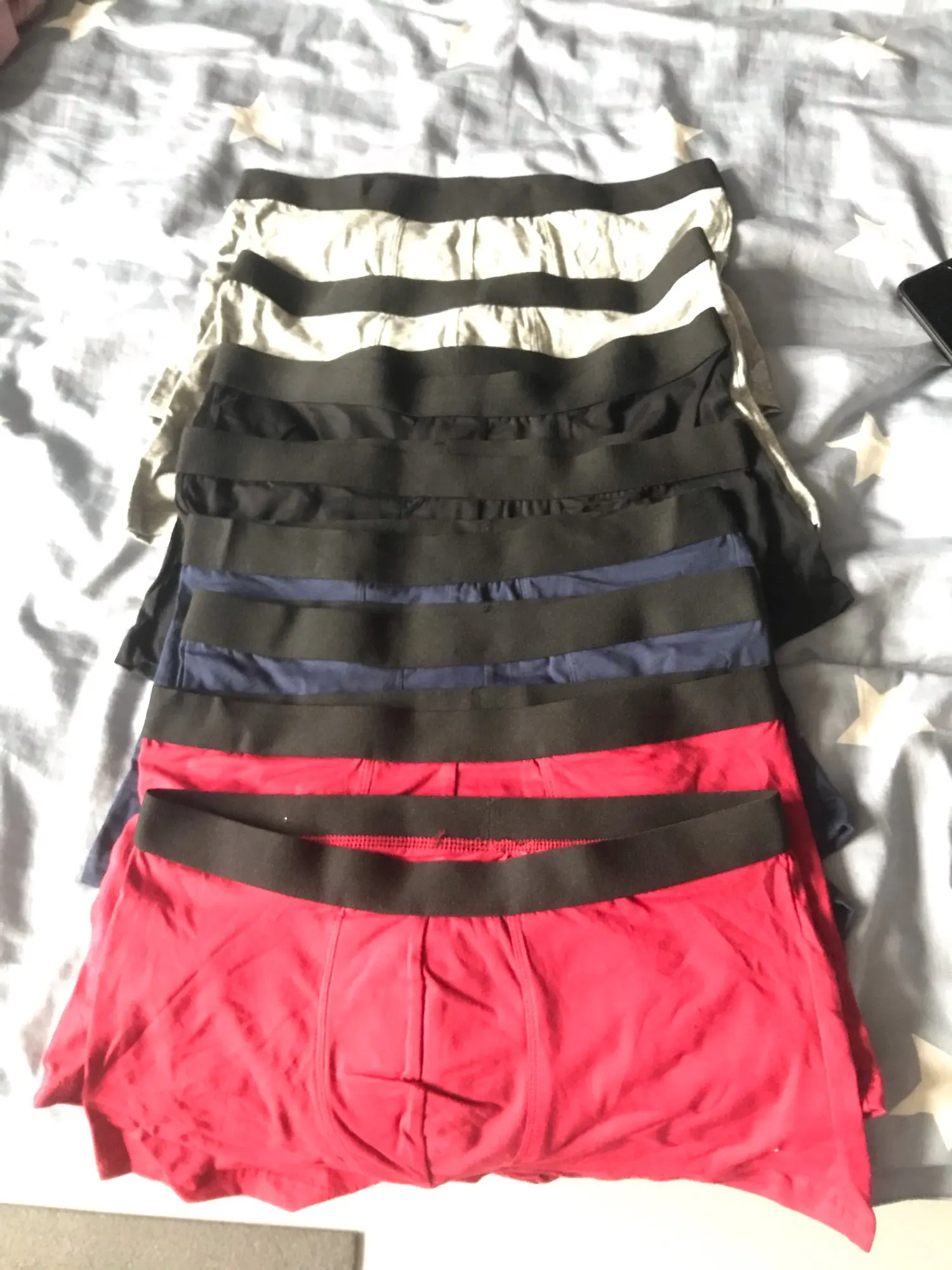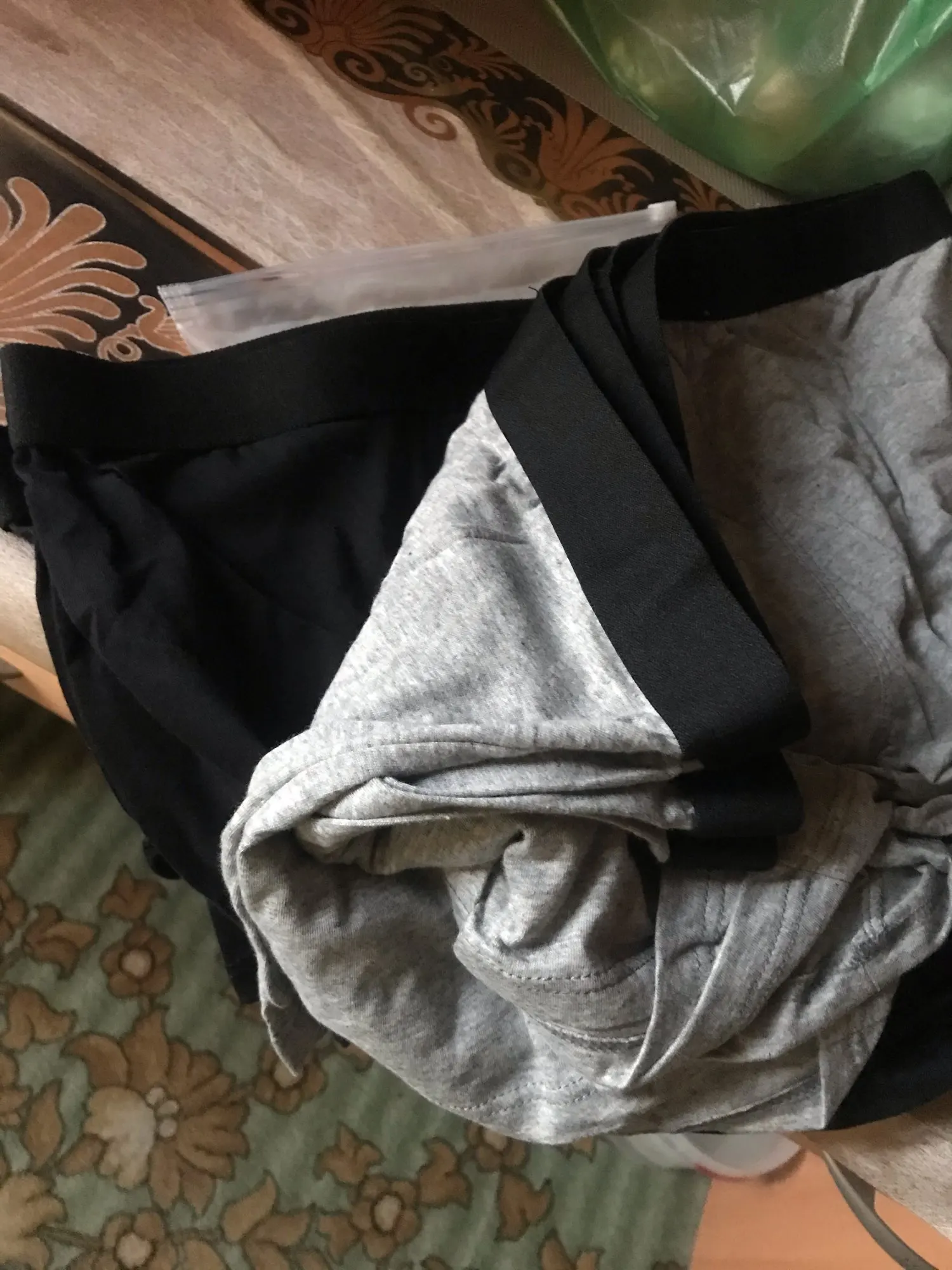 пришло на почту, несколько пакетов объединили в один пакет. материал приятный на ощупь. резинка широкая, черного цвета, пришли сверху( пока непонятно как будет по носкости) выглядит дешевле заплаченных денег, швы качественные и ровные(как робот шил). сразу постирал, вдруг инфекции или обрабатывали химией?! мне как раз(где то 50й размер на наши, я не очень по упитанности средний.