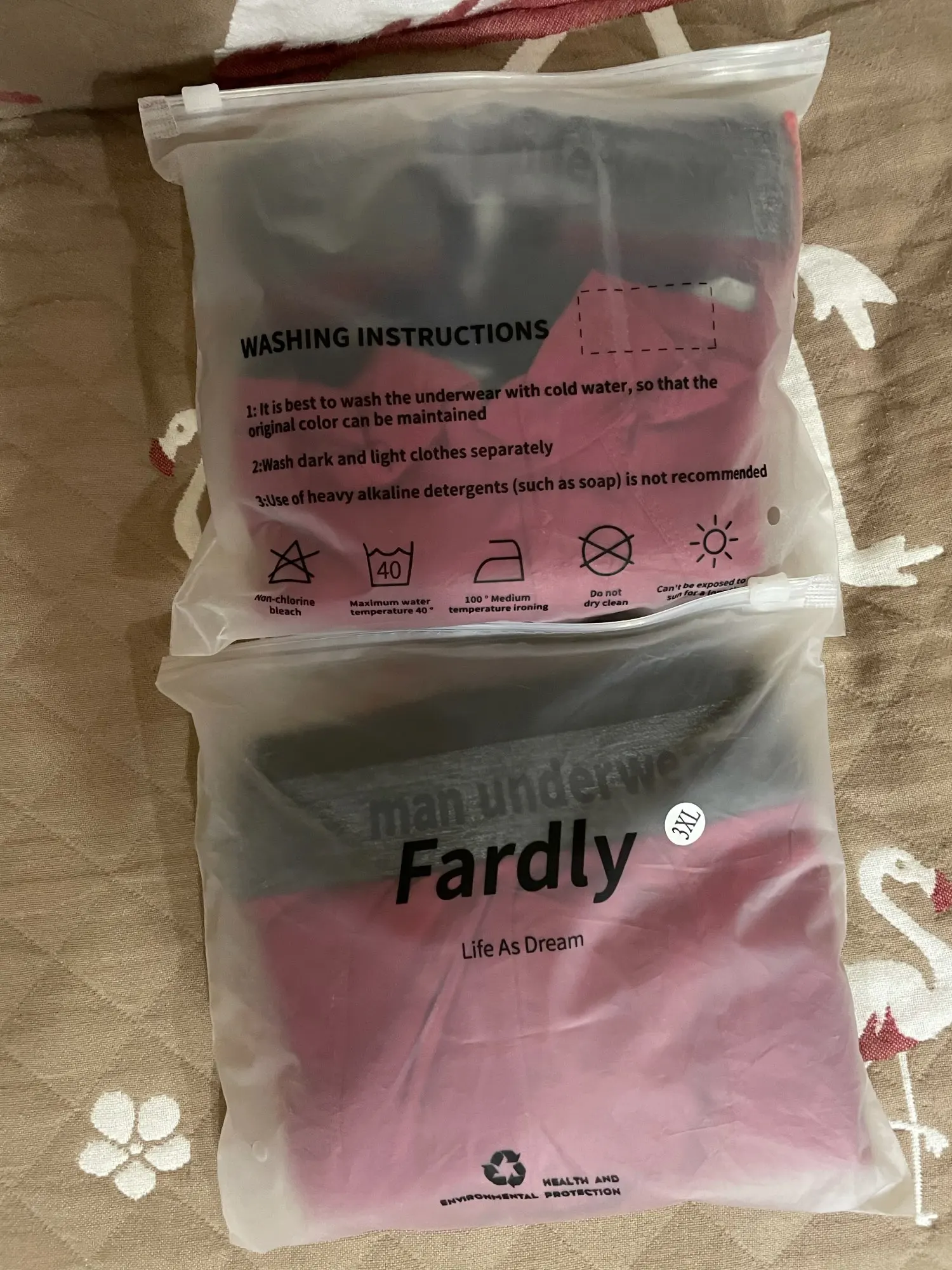 Пришло быстро на почту, в каждой пачке по 4 пары трусов, получается очень выгодно. На мужчину 52го размера вполне подойдёт. На несколько лет вперёд хватит главное чтобы не поправился)) . А ещё в каждой пачке небольшой брелок или браслет (не поняла что это) приятная мелочь)))
