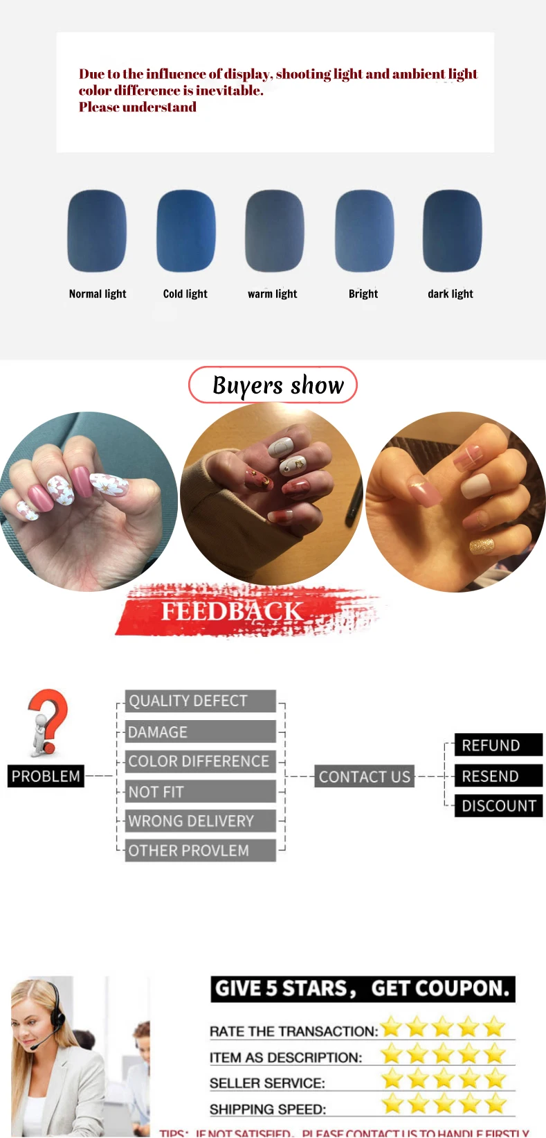 Доставка примерно полтора месяца.Еще не пробовала их клеить,но по отзывам пишут что держатся хорошо.В наборе ногти разных размеров для любых ногтей от самых маленьких до самых больших это очень радует.Цвет именно этой модели немного ярче чем на картинке.В целом товаром довольна.