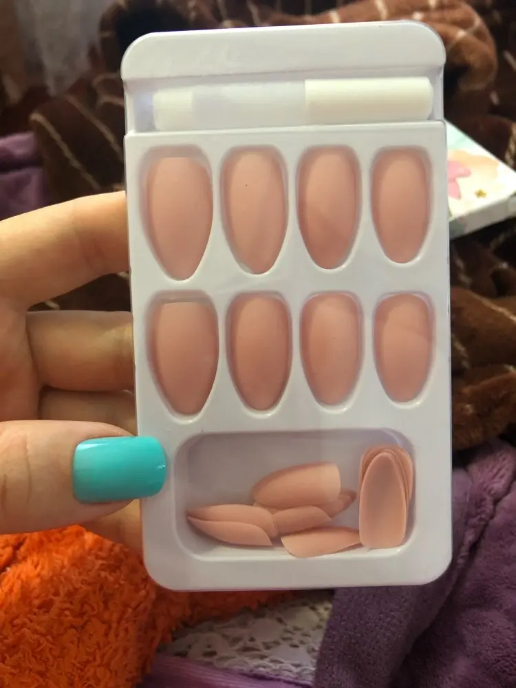 Заказала 11 ноября, пришло 1 декабря. Ногти хорошие, цвет красивый. В комплекте идёт клей. Хожу уже 2 дня, отвалились только 2 ногтя, но их можно снова приклеить. Товар хороший, соответствует описанию.
