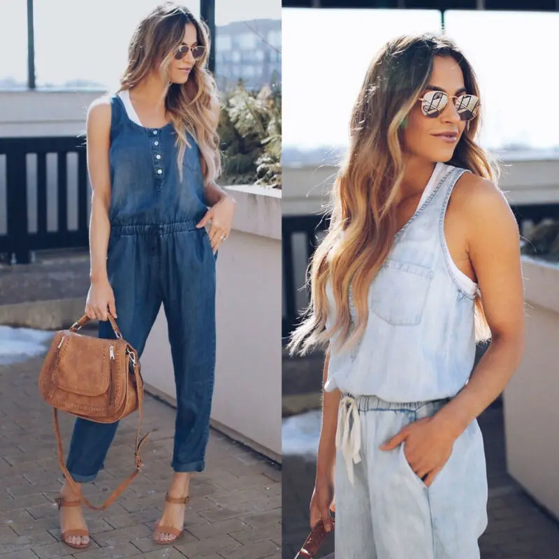 Комбинезон женский джинсовый без рукавов, Модный повседневный уличн...