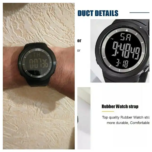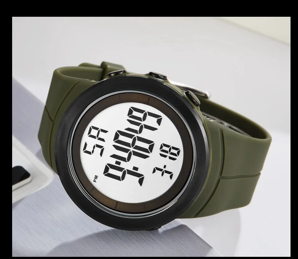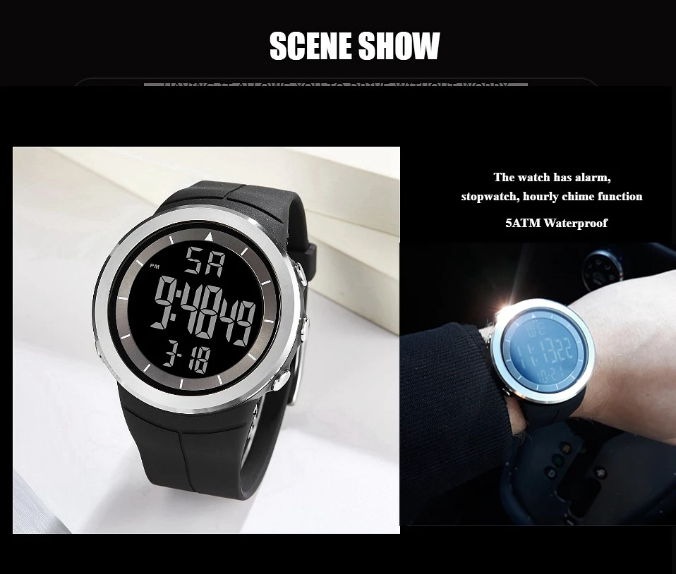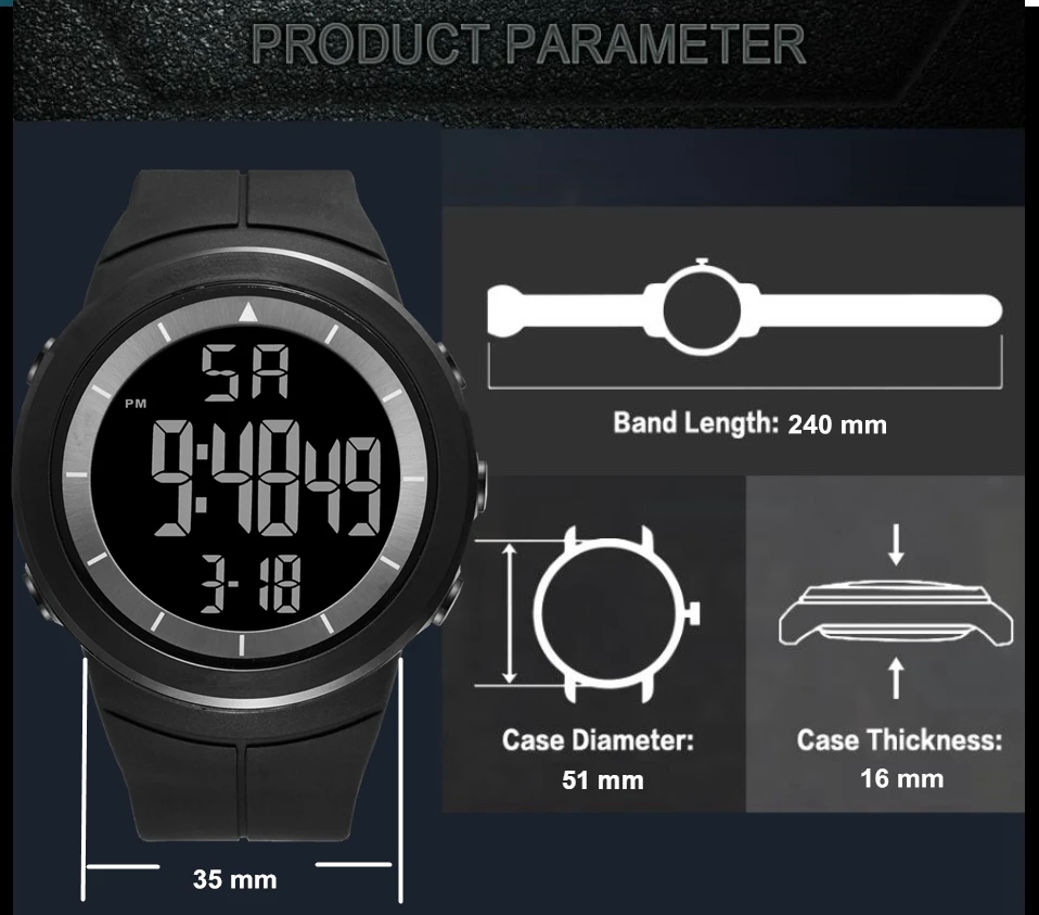 Цифровой: часы, минуты, секунды, pm, месяц, дата, день12/24 формата отображения времениФункция будильника и ежечасного звонкаСпециальный дизайн с хронографом (секундомером) с шагом 0,01 секундВодонепроницаемость до 50 м (не нажимайте кнопки в воде)Дополнительная функция подсветки ЖК-дисплея для четкого отображения времени в темноте